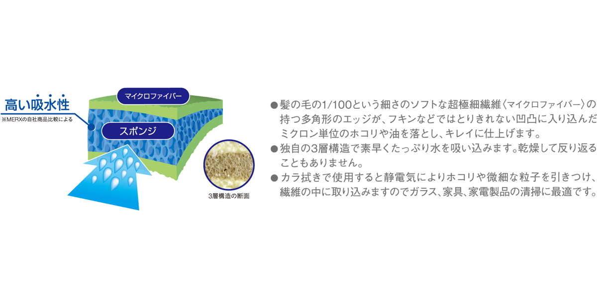●独自の三層構造マイクロファイバーで油汚れや水はねもすばやく吸収します。