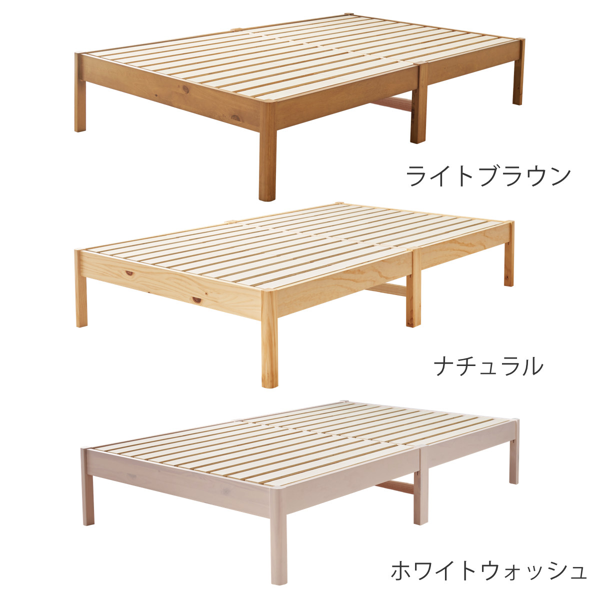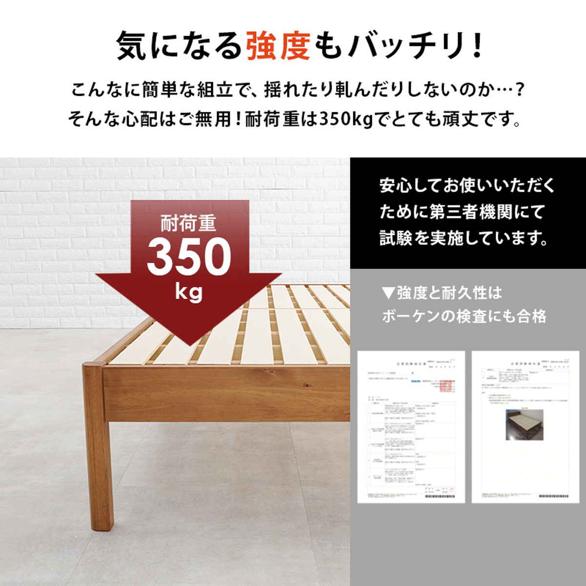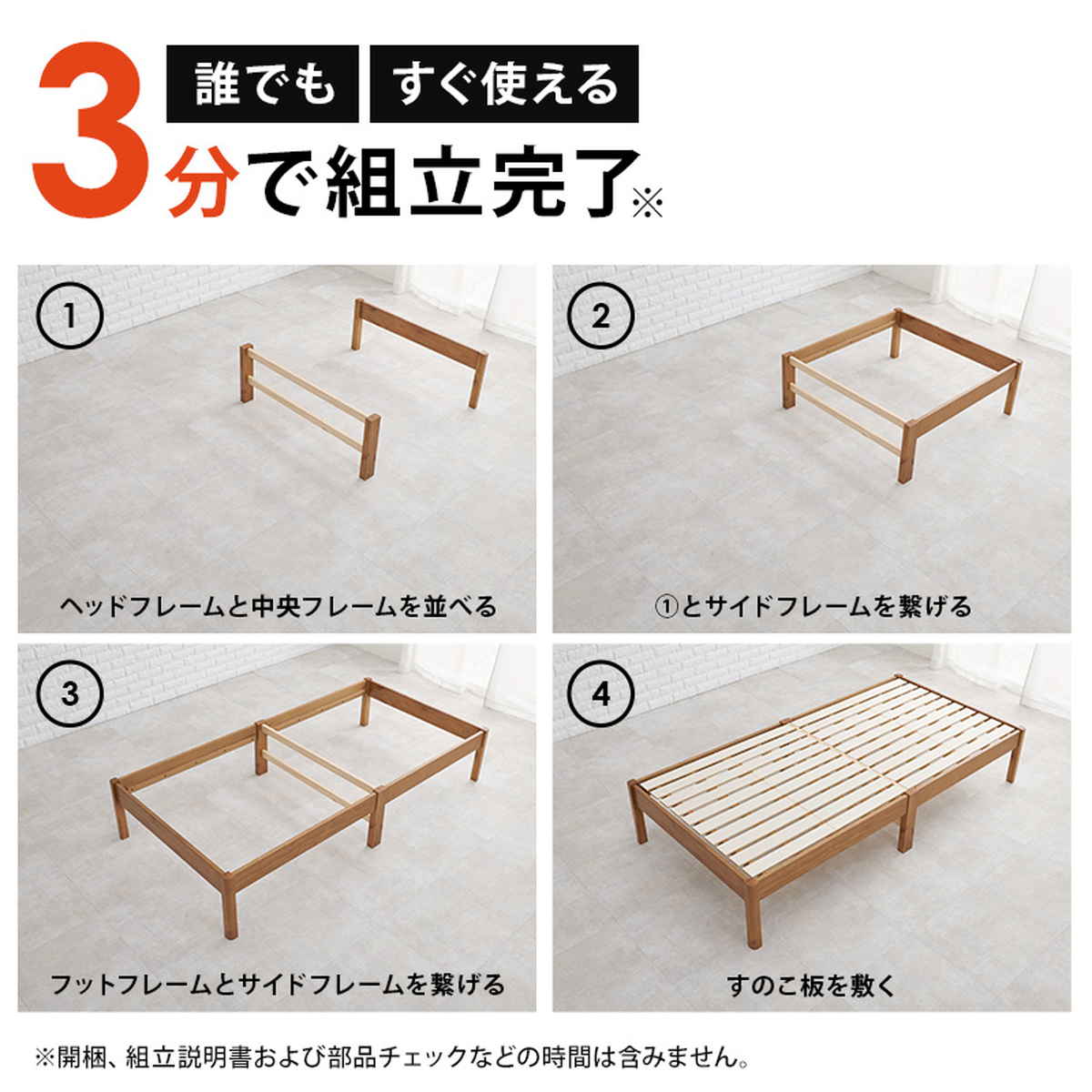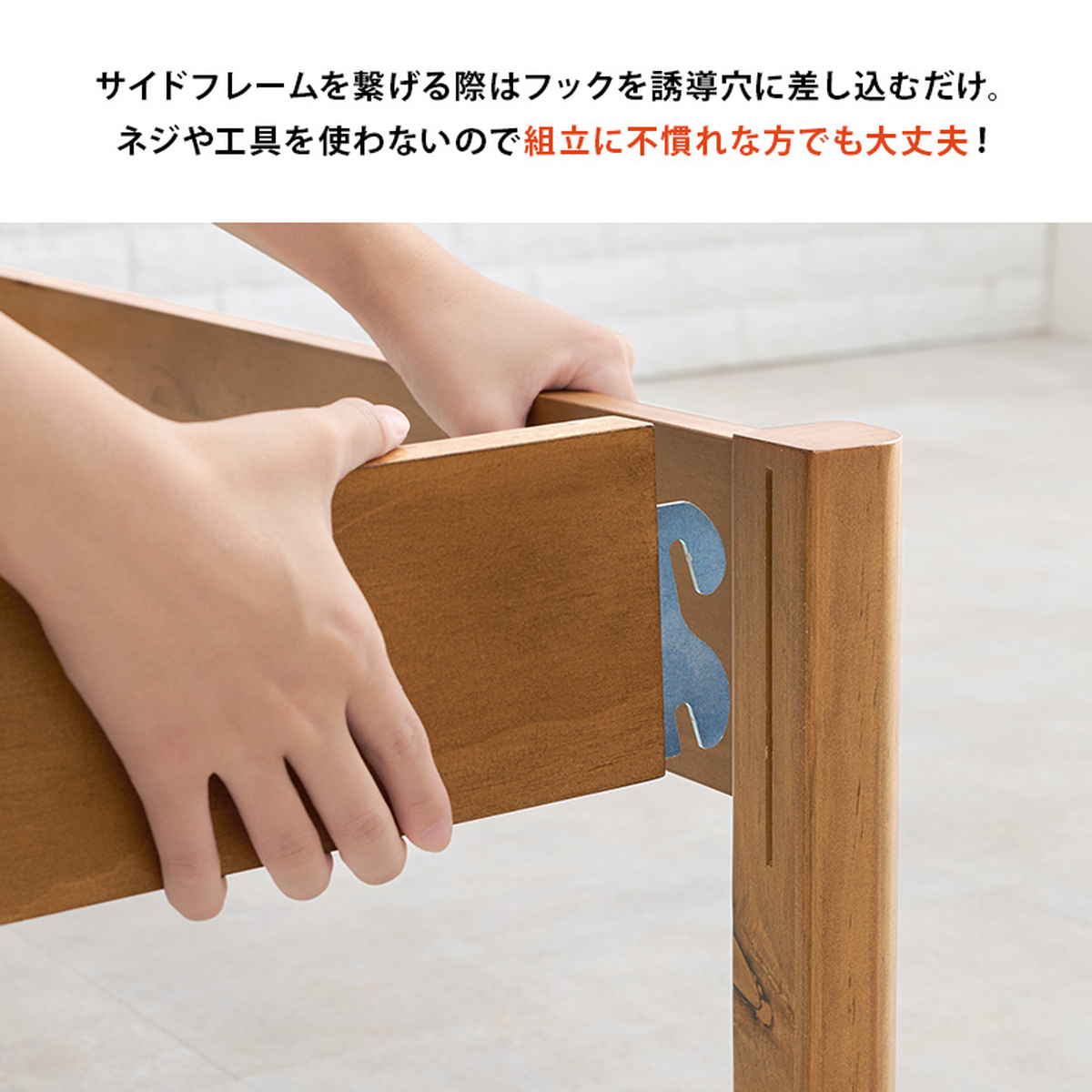ネジや工具が不要で、簡単に組み立てられるベッドフレームです。パーツを差し込むだけなので、組み立て家具が苦手な方でもたった3分で組み立てることができます。天然木の温もりを感じられる柔らかなパイン材を使用しており、美しい木目と経年による色の変化も楽しめます。