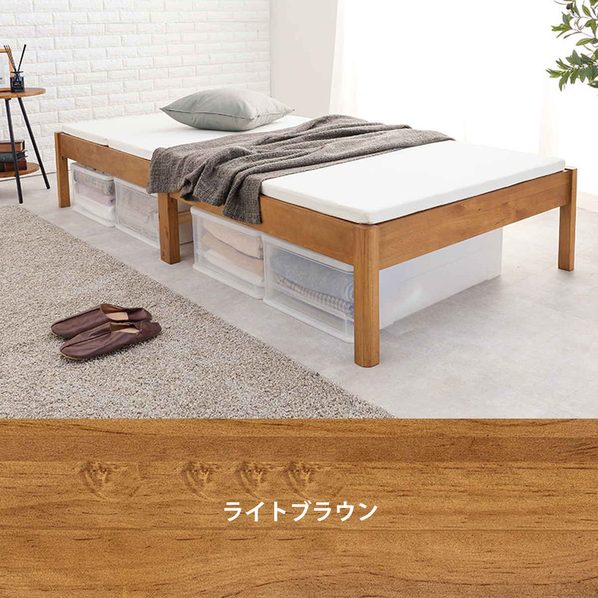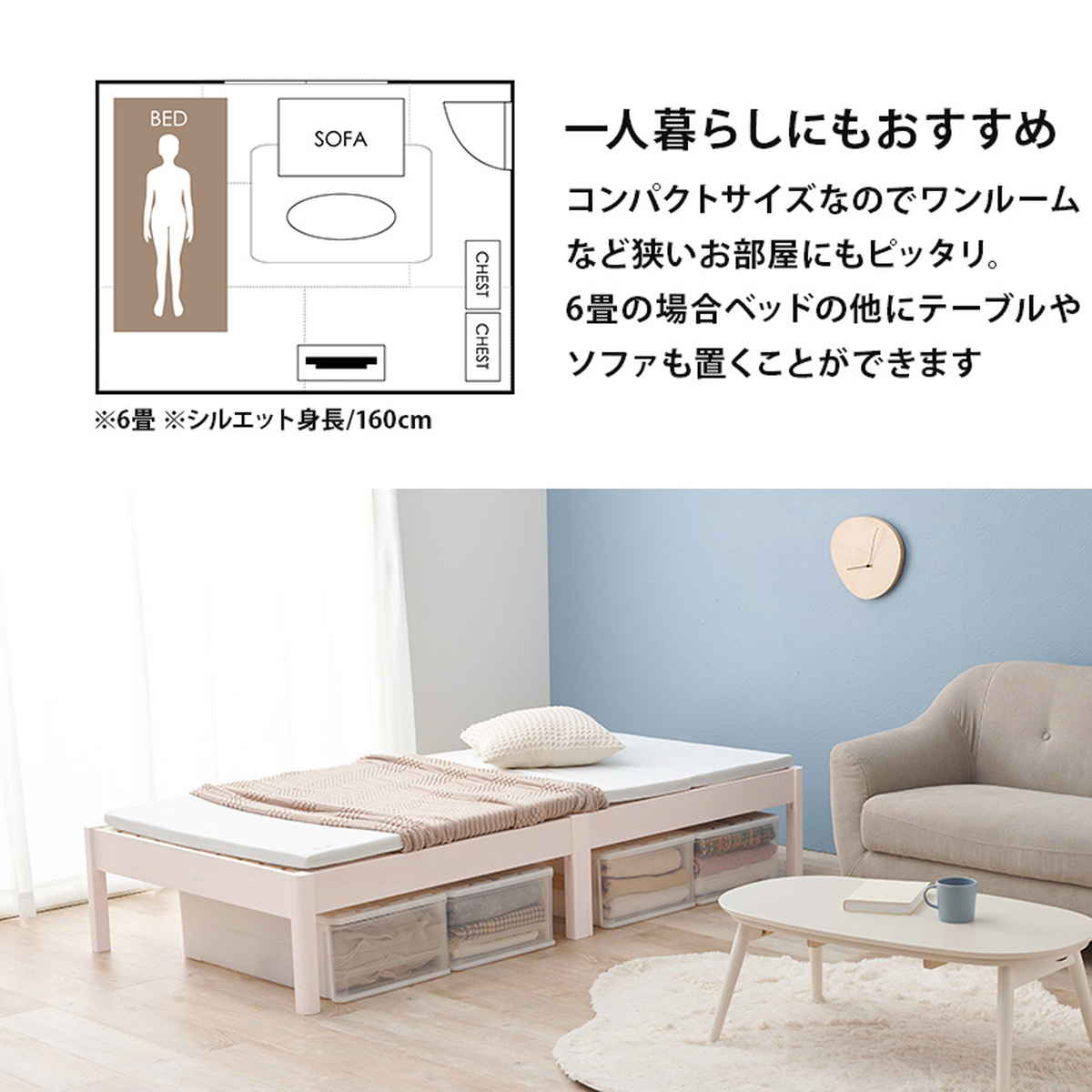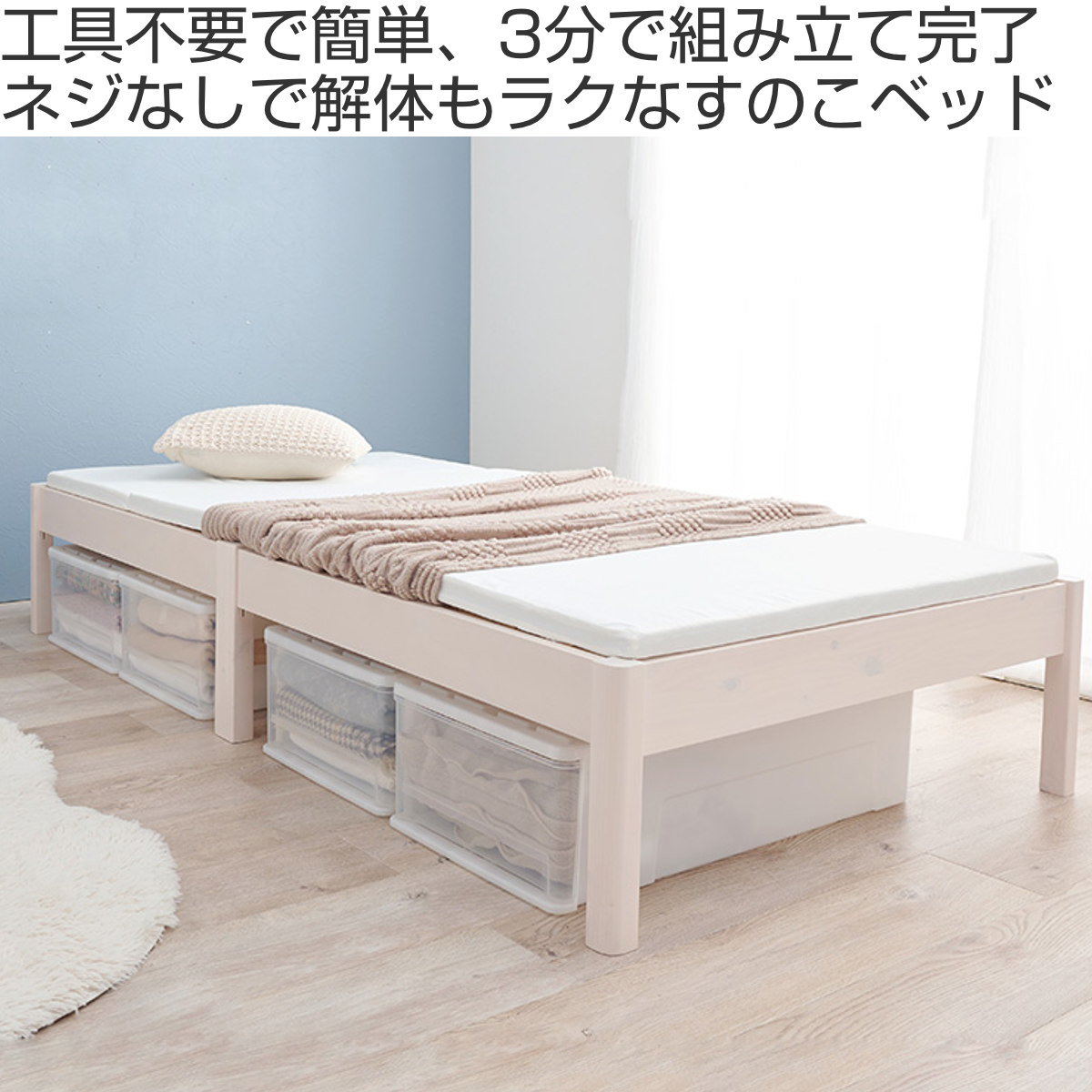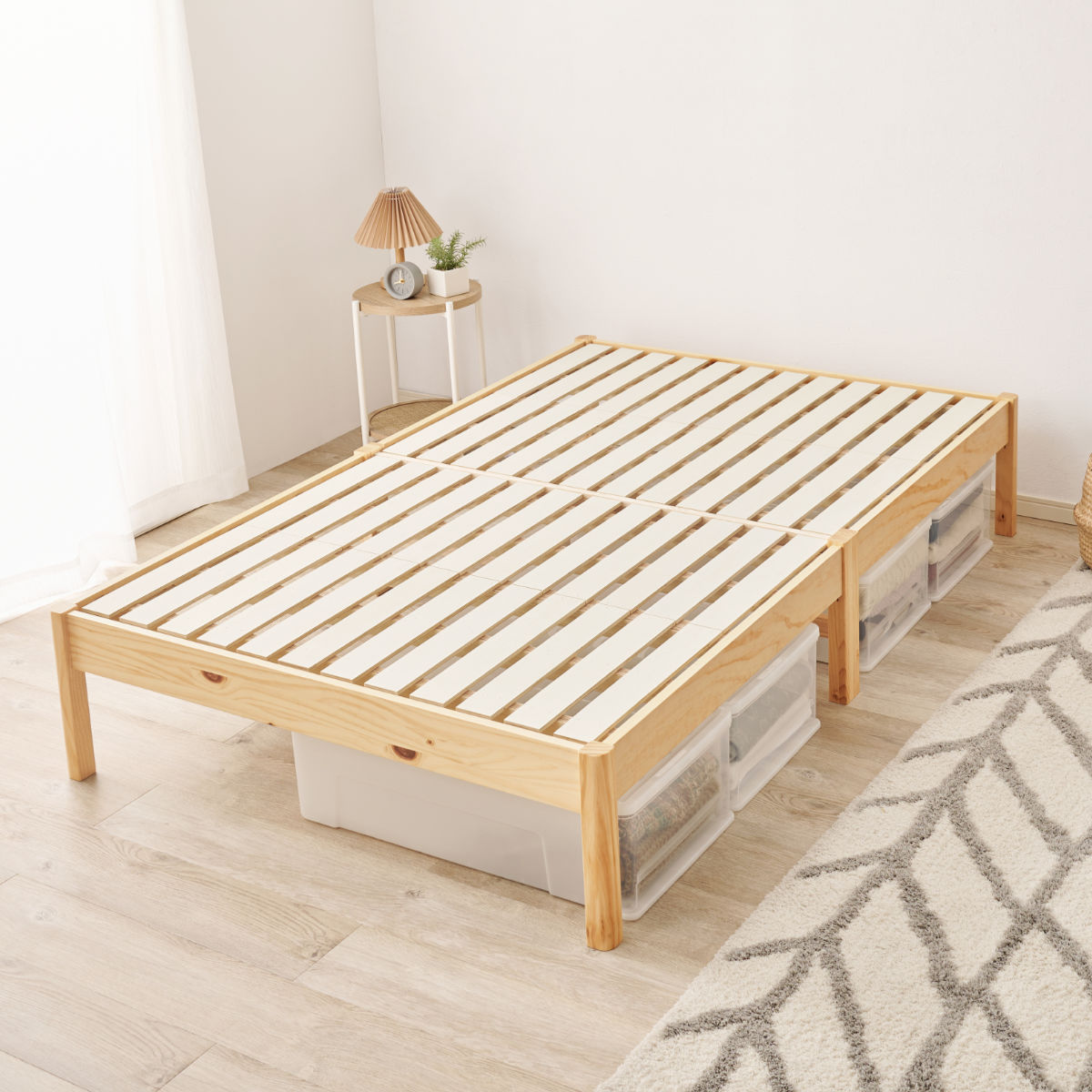 ネジや工具が不要で、簡単に組み立てられるベッドフレームです。パーツを差し込むだけなので、組み立て家具が苦手な方でもたった3分で組み立てることができます。天然木の温もりを感じられる柔らかなパイン材を使用しており、美しい木目と経年による色の変化も楽しめます。