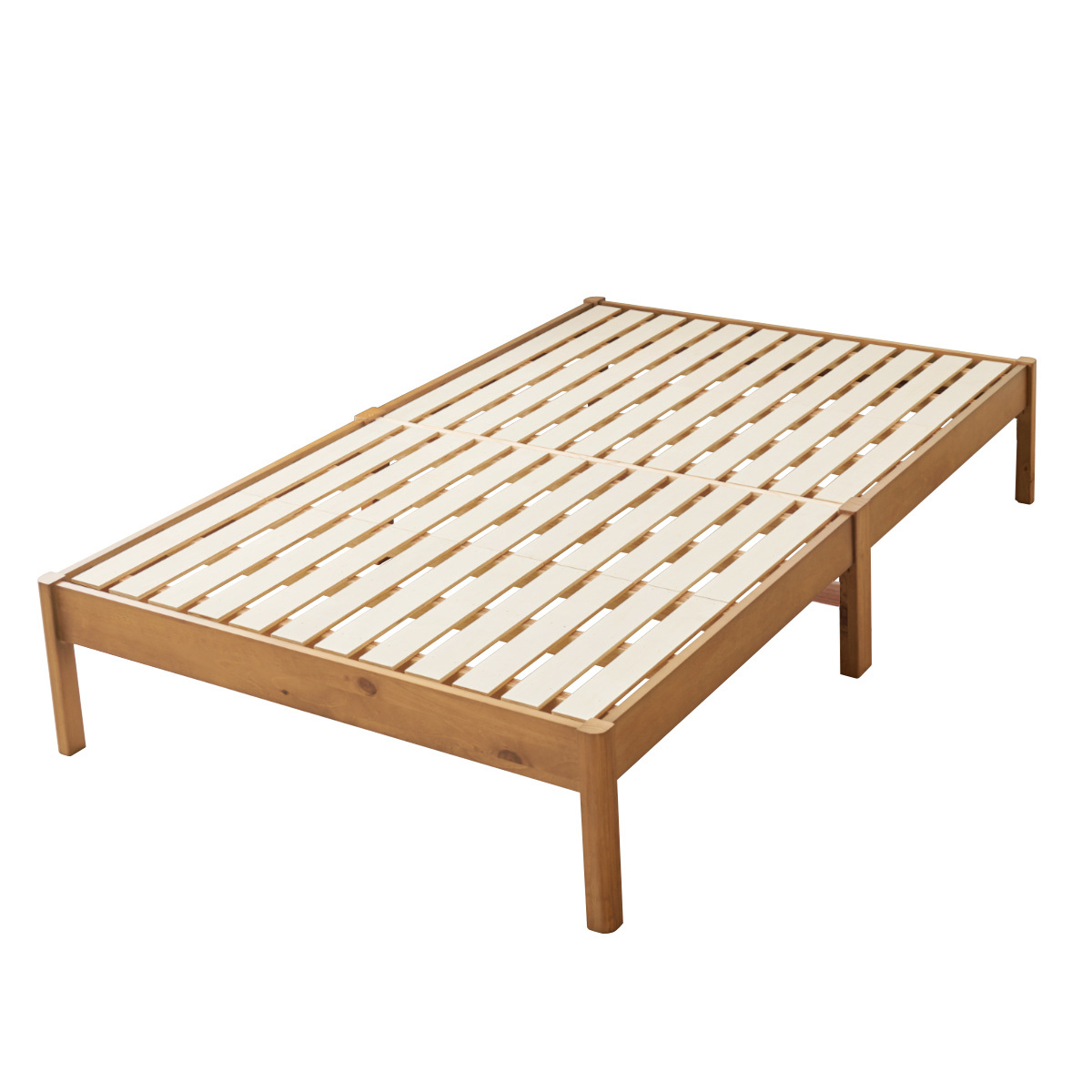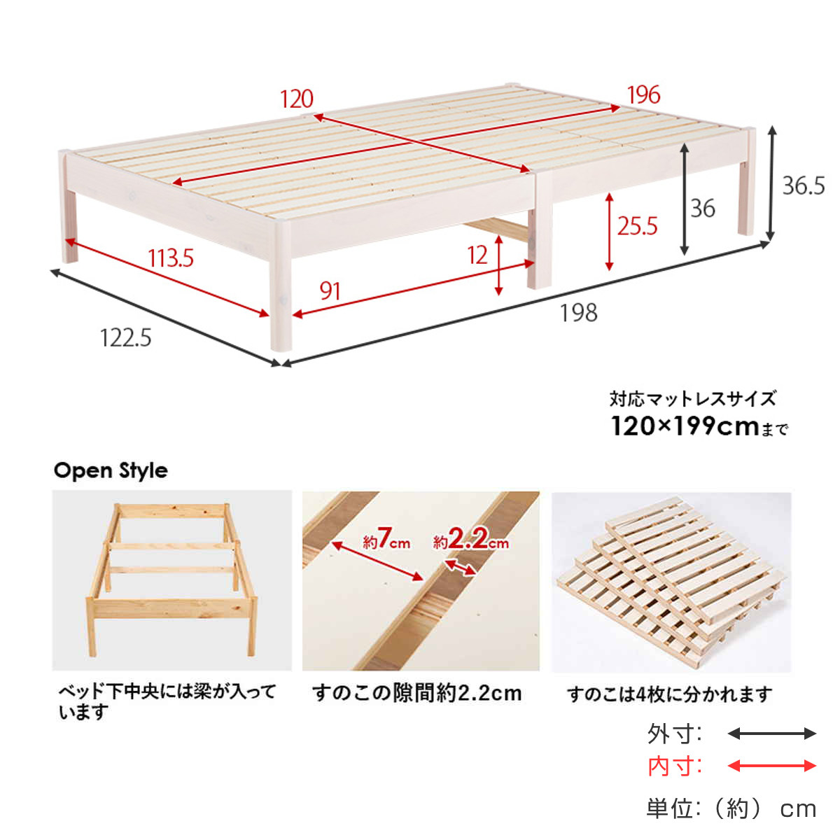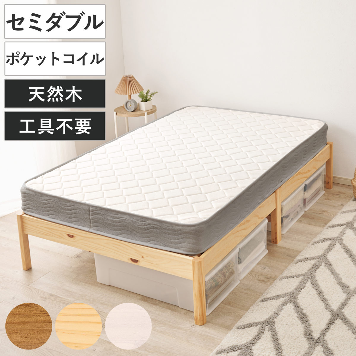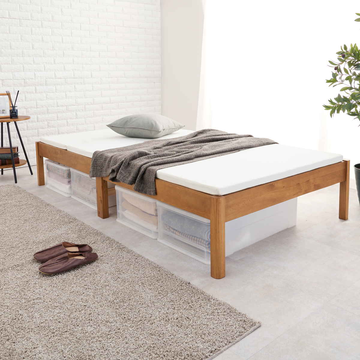 ネジや工具が不要で、簡単に組み立てられるベッドフレームです。パーツを差し込むだけなので、組み立て家具が苦手な方でもたった3分で組み立てることができます。天然木の温もりを感じられる柔らかなパイン材を使用しており、美しい木目と経年による色の変化も楽しめます。