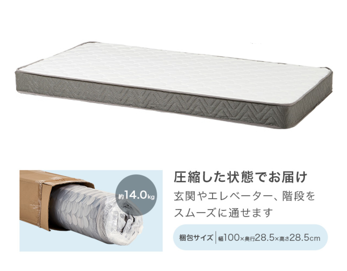 マットレスは、ロール状のコンパクトな圧縮梱包でのお届けです。大きなマットレスはベッドまでの移動が大変ですが、玄関やエレベーター、階段をスムーズに通せます。簡単に、安心して搬入・設置をしていただけます。お部屋のスペースが限られている方にもおすすめです。