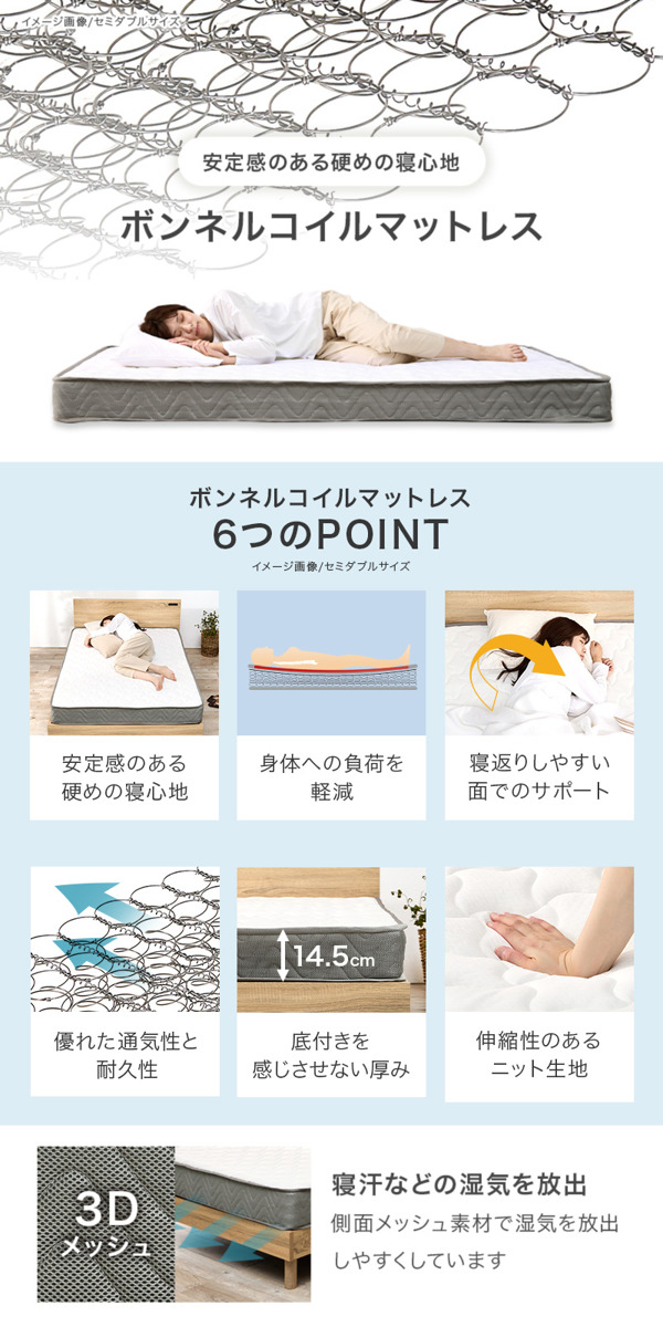 コイル同士が連結されており、体を面でしっかりと支えてくれます。マットレス内部の通気性が良く、耐久性が高いのも特徴のひとつです。表面の伸縮性に優れたニット生地が寝返りのときも体に優しくフィットします。側面には3Dメッシュ素材を採用。寝汗などの湿気を放出しやすくなっています。