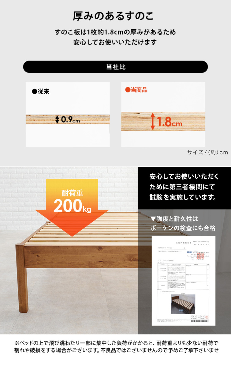厚みのあるすのこにしっかりと太さのある柱を使用しています。高耐荷重で丈夫な作りなので、毎日安心してお使いいただけます。寝ていてもきしみにくく、抜群の安定感です。