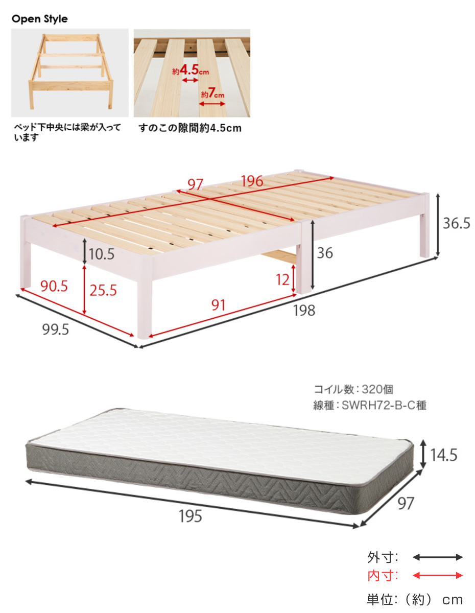 | サイズ | ベッド:約 幅99.5×奥行198×高さ36.5(cm) 床面高:36(cm) マットレス:約 幅97×奥行195×高さ14.5(cm) |