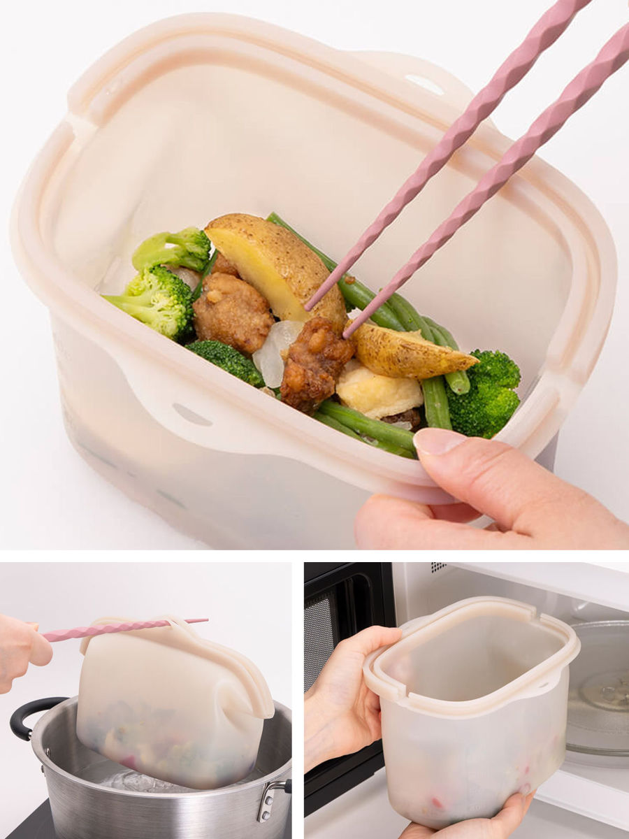 電子レンジ・オーブン・湯せんで調理ができ、冷蔵庫・冷凍庫での保存が可能なので幅広いシーンでお使いいただけます。また、間口が広いのでボウル代わりに使うこともでき、洗い物を減らすことができます。シリコーンバッグの中で調理から保存まで一つでできて便利です。