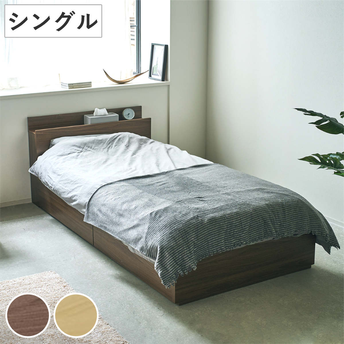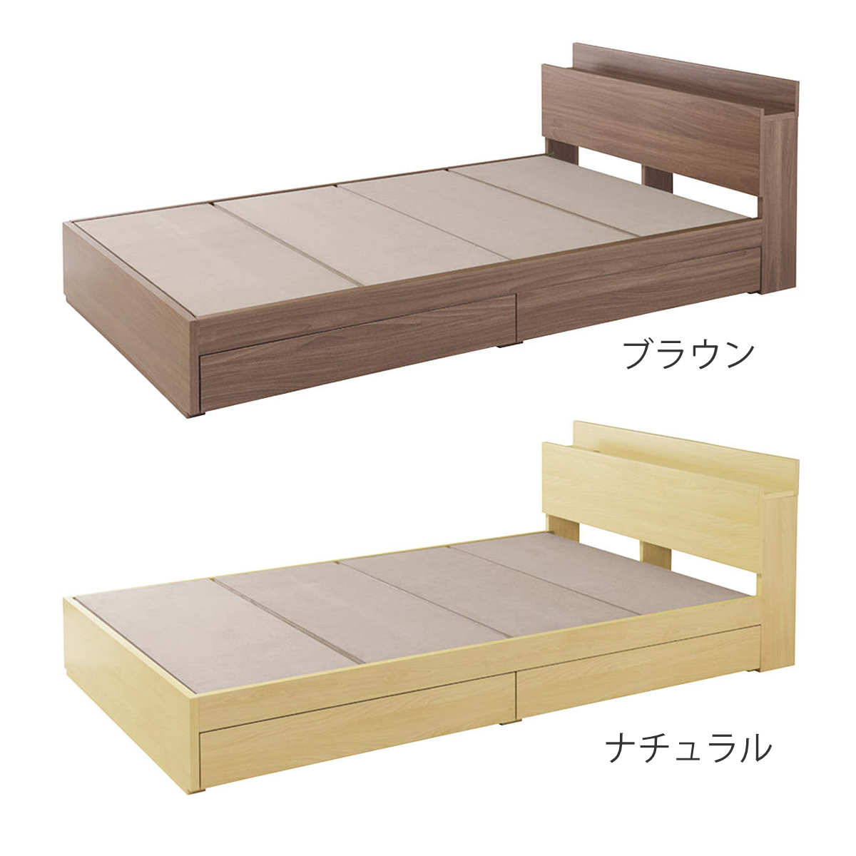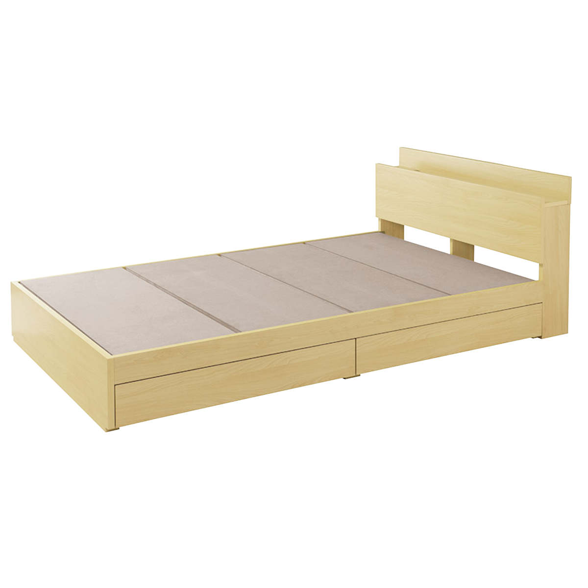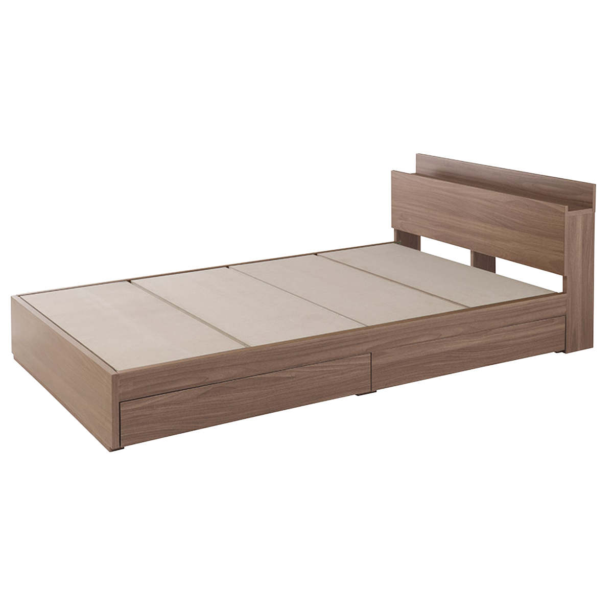 温もりのある木目柄が魅力のベッドフレームです。床板下には、衣類やシーズンオフの寝具などを収納しておける2杯の引出し付きです。