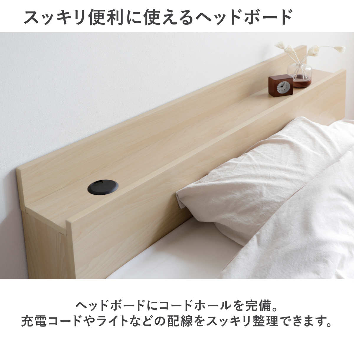 枕元にメガネや時計を置くことができるヘッドボードにはコードホールを完備。充電コードやライトの配線を通してすっきりと整理できます。
