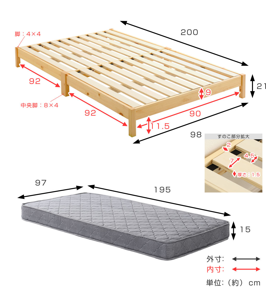 | サイズ | 約 幅98×奥行200×高さ21(cm) マットレス:約 幅97×奥行195×高さ15(cm) |