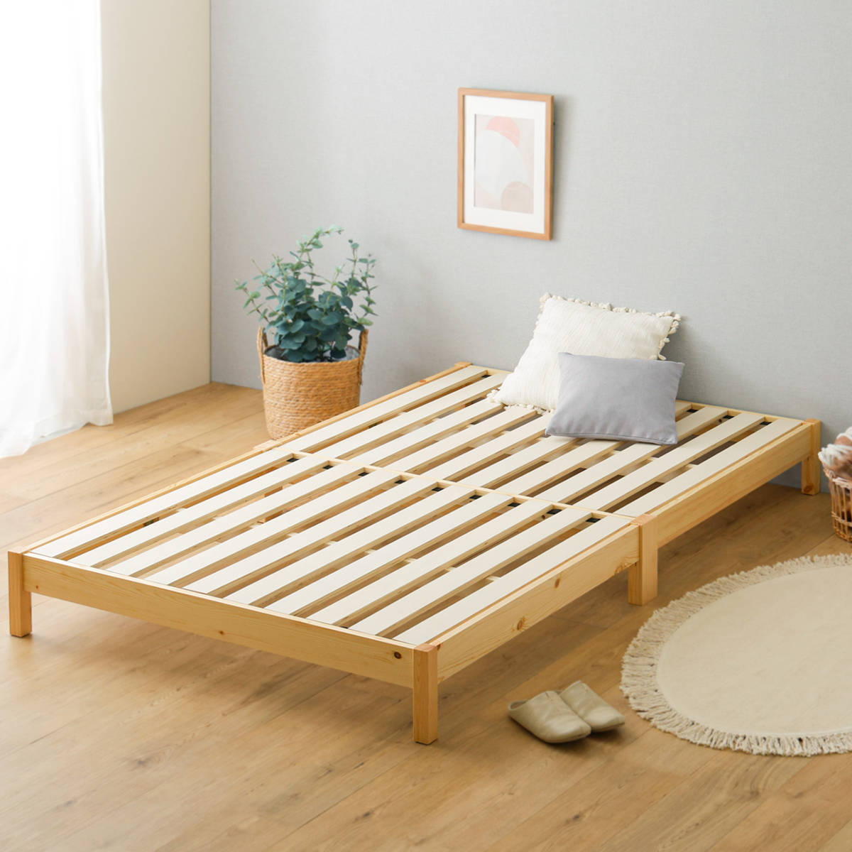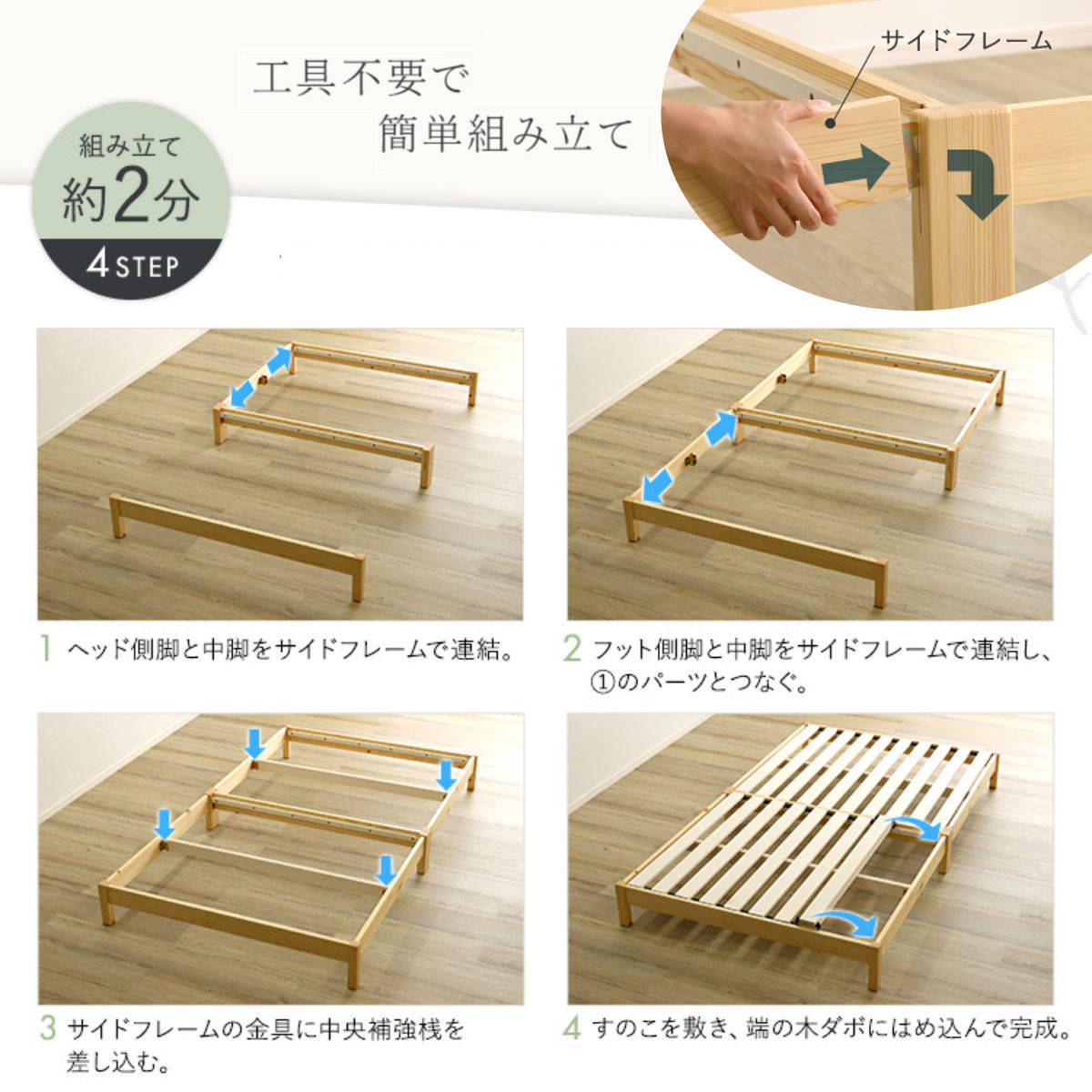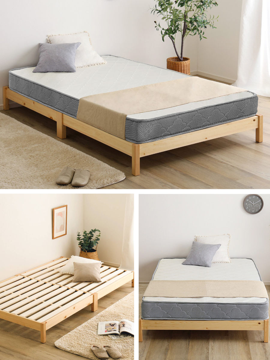 工具やネジを使わず、フレームを差し込み、すのこを木ダボにはめるだけの簡単設計。ベッドフレームが約2分で組み立て完了します。マットレスがセットになっているので、別々に選ぶ手間がなく、届いた日からすぐに快適な眠りを始められます。