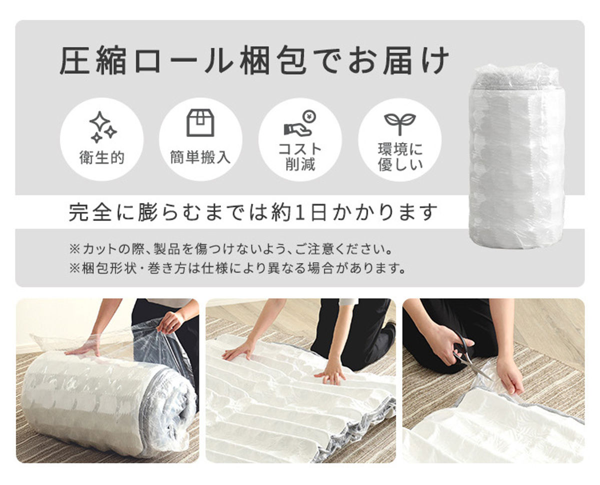 ロール状のコンパクトな圧縮梱包でのお届けです。大きなマットレスはベッドまでの移動が大変ですが、玄関やエレベーター、階段をスムーズに通せます。簡単に、安心して搬入・設置をしていただけます。