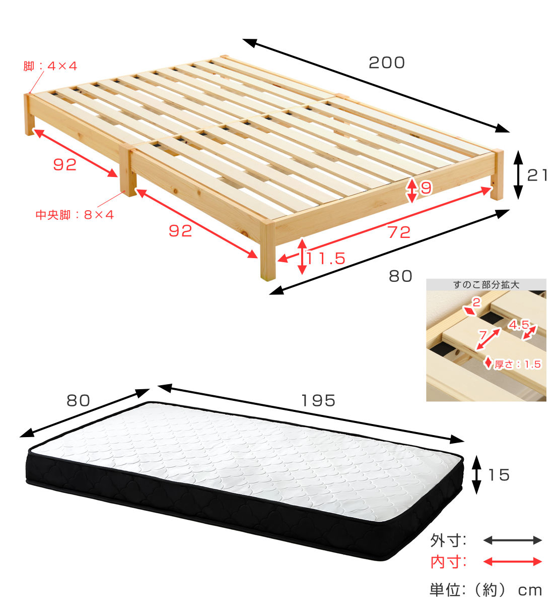 | サイズ | 約 幅80×奥行200×高さ21(cm) マットレス:約 幅80×奥行195×高さ15(cm) |