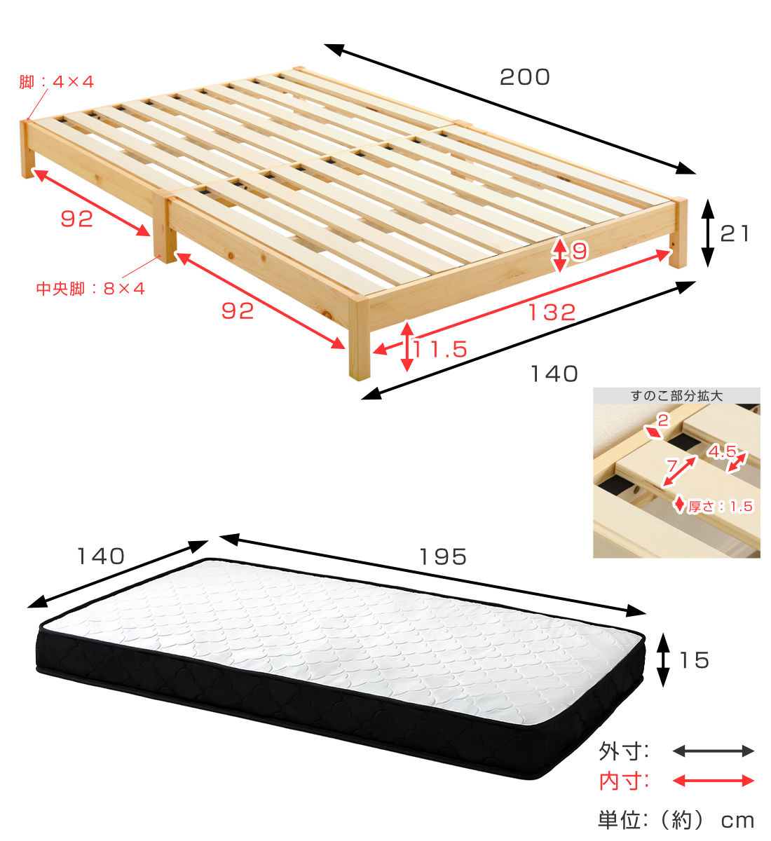 | サイズ | 約 幅140×奥行200×高さ21(cm) マットレス:約 幅140×奥行195×高さ15(cm) |