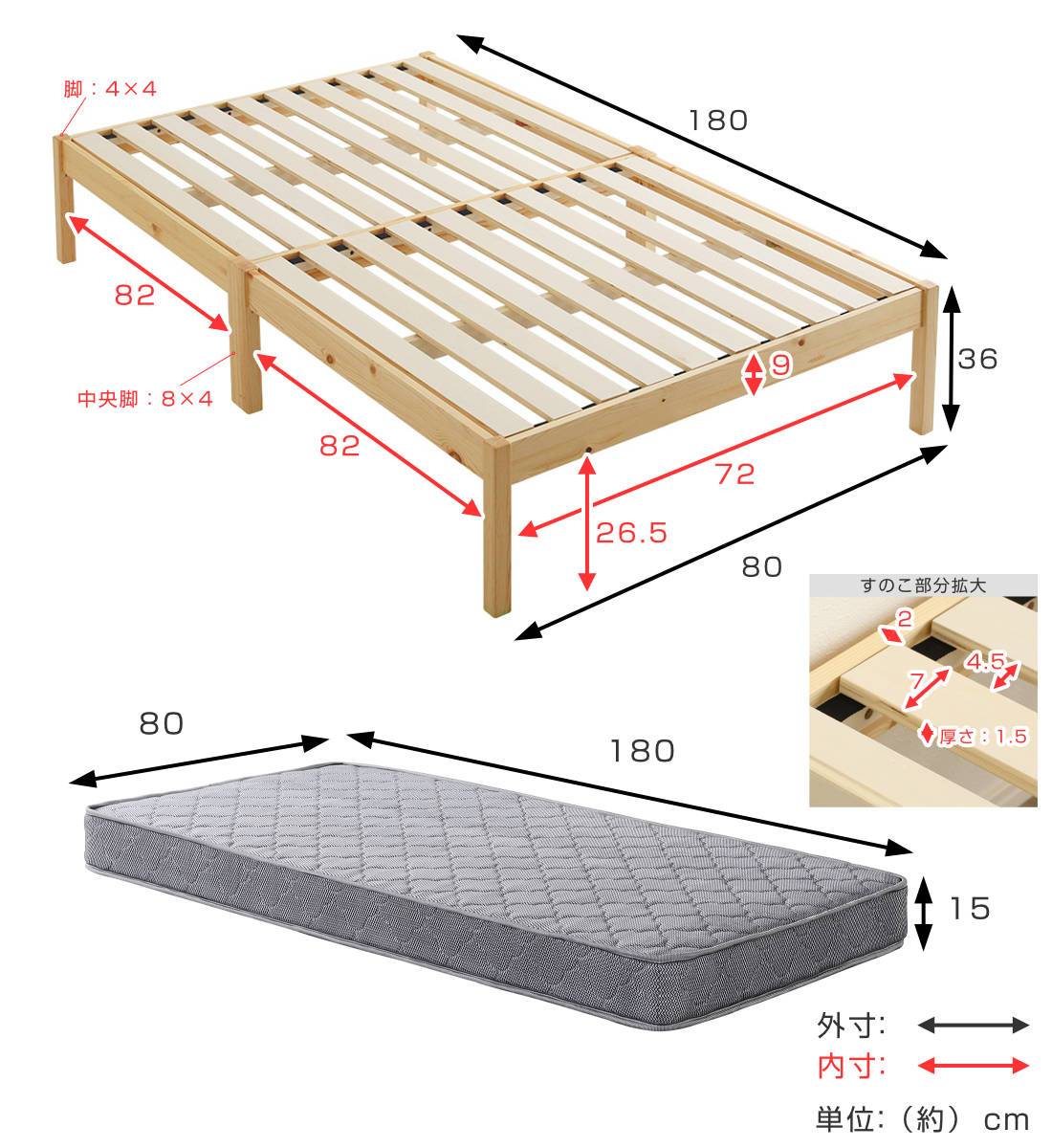 | サイズ | 約 幅80×奥行180×高さ36(cm) マットレス:約 幅80×奥行180×高さ15(cm) |