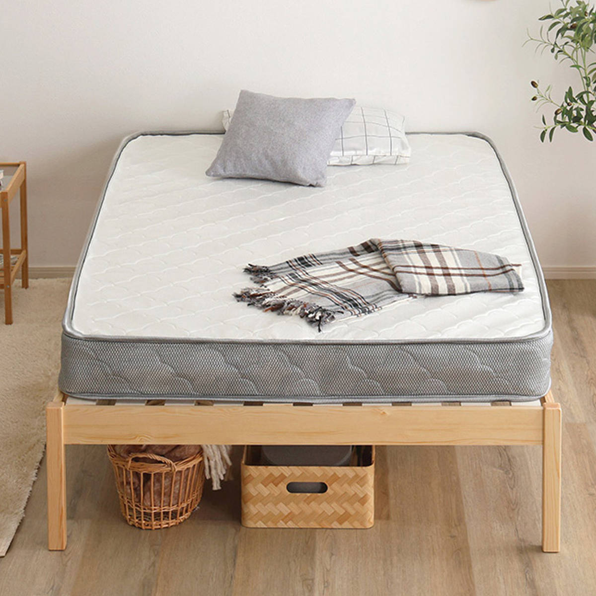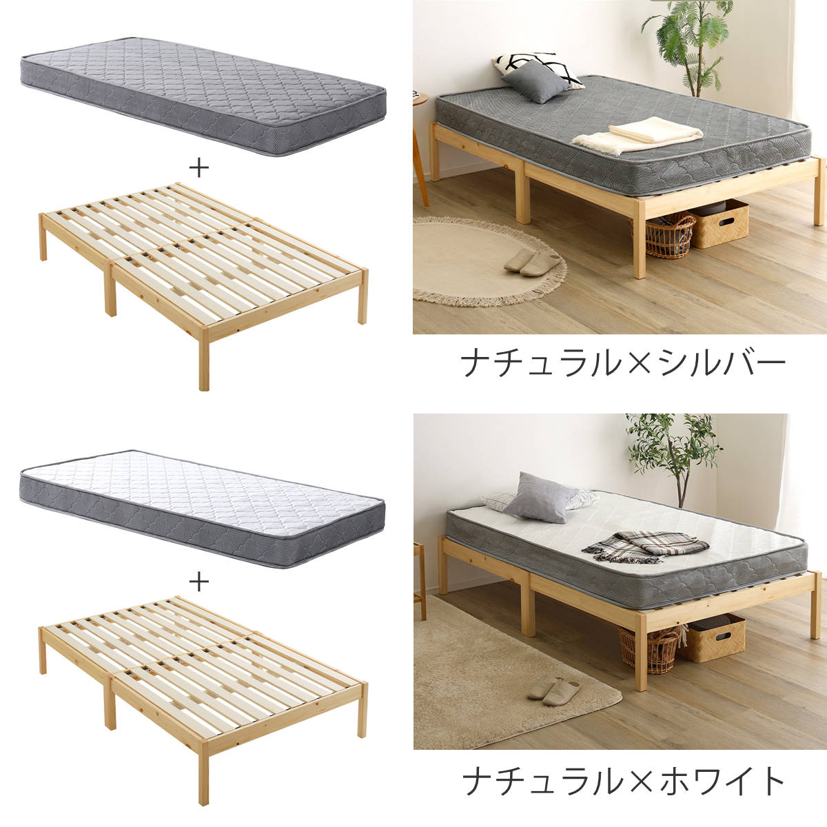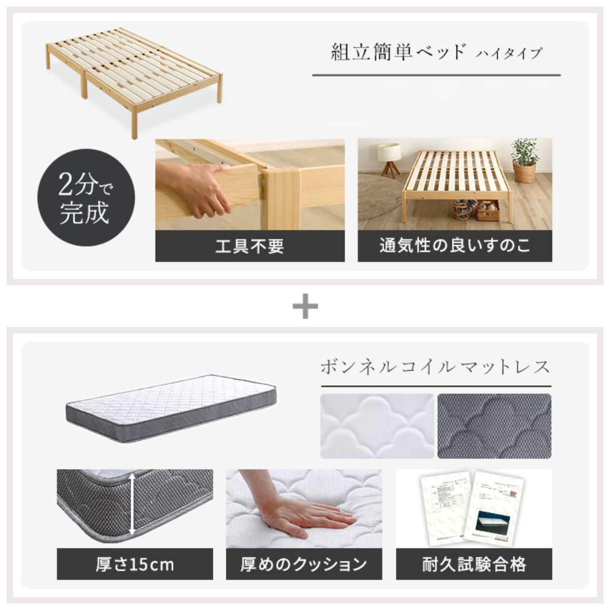工具やネジを使わず、フレームを差し込み、すのこを木ダボにはめるだけの簡単設計。ベッドフレームが約2分で組み立て完了します。マットレスがセットになっているので、別々に選ぶ手間がなく、届いた日からすぐに快適な眠りを始められます。