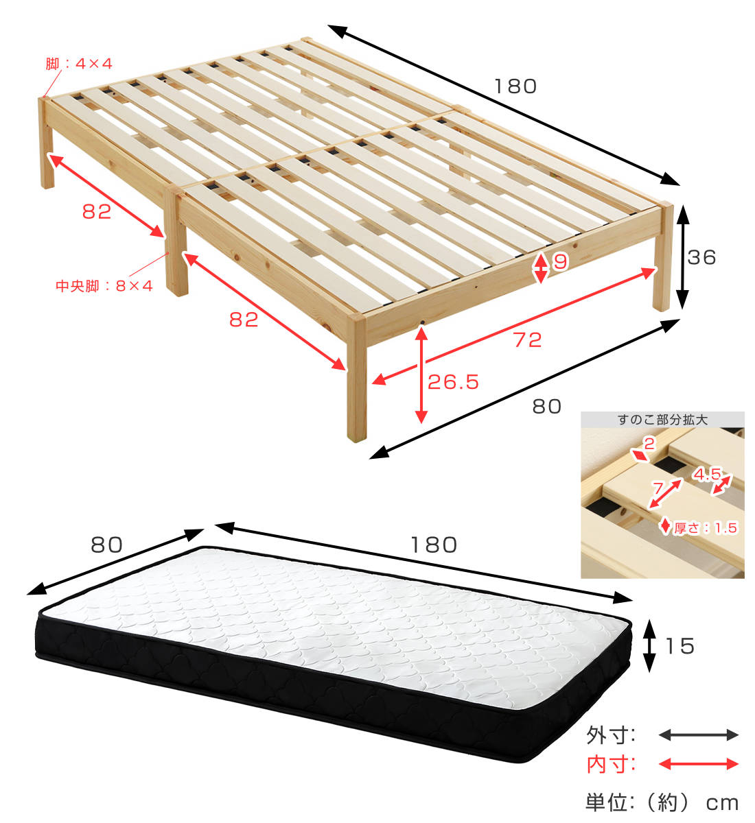 | サイズ | 約 幅80×奥行180×高さ36(cm) マットレス:約 幅80×奥行180×高さ15(cm) |