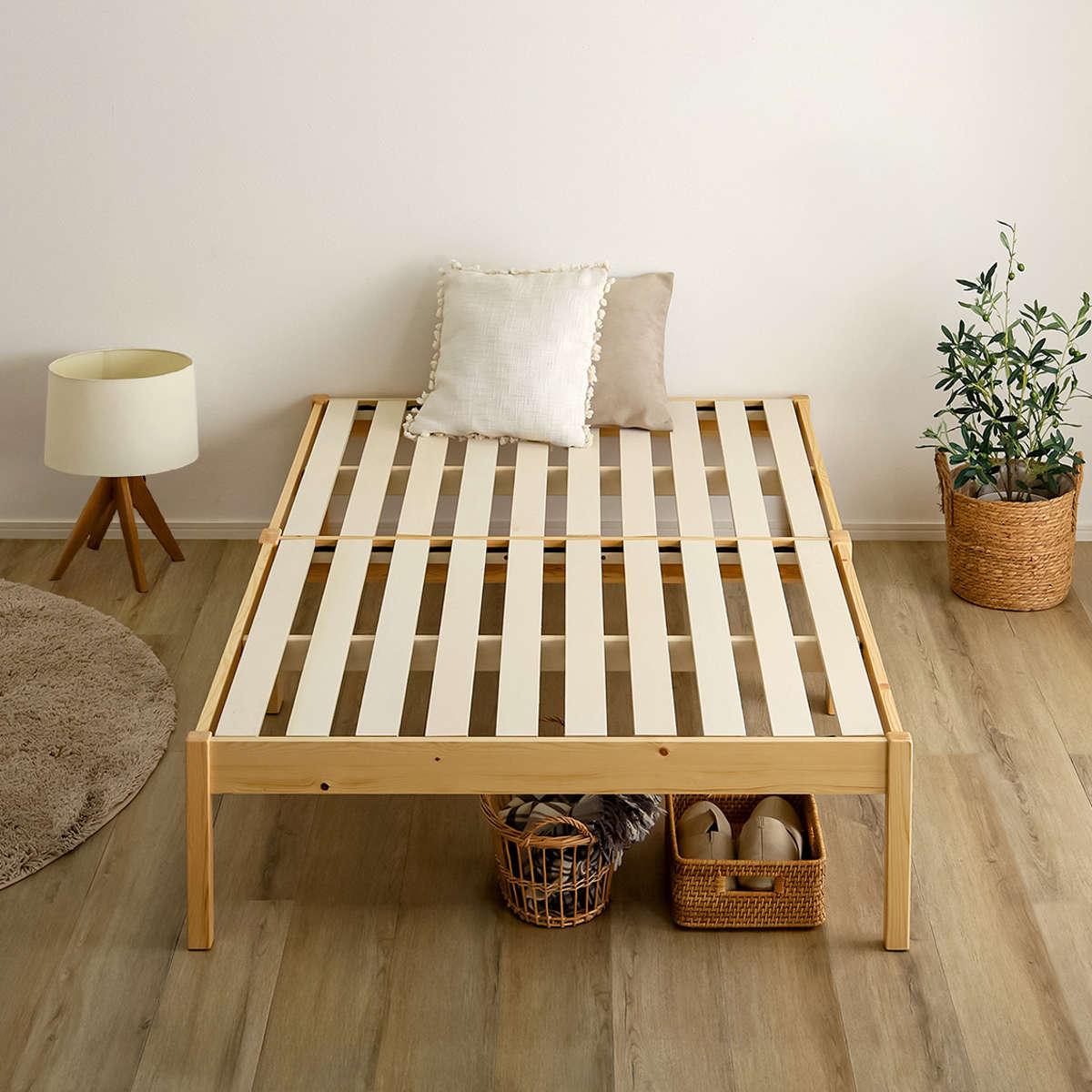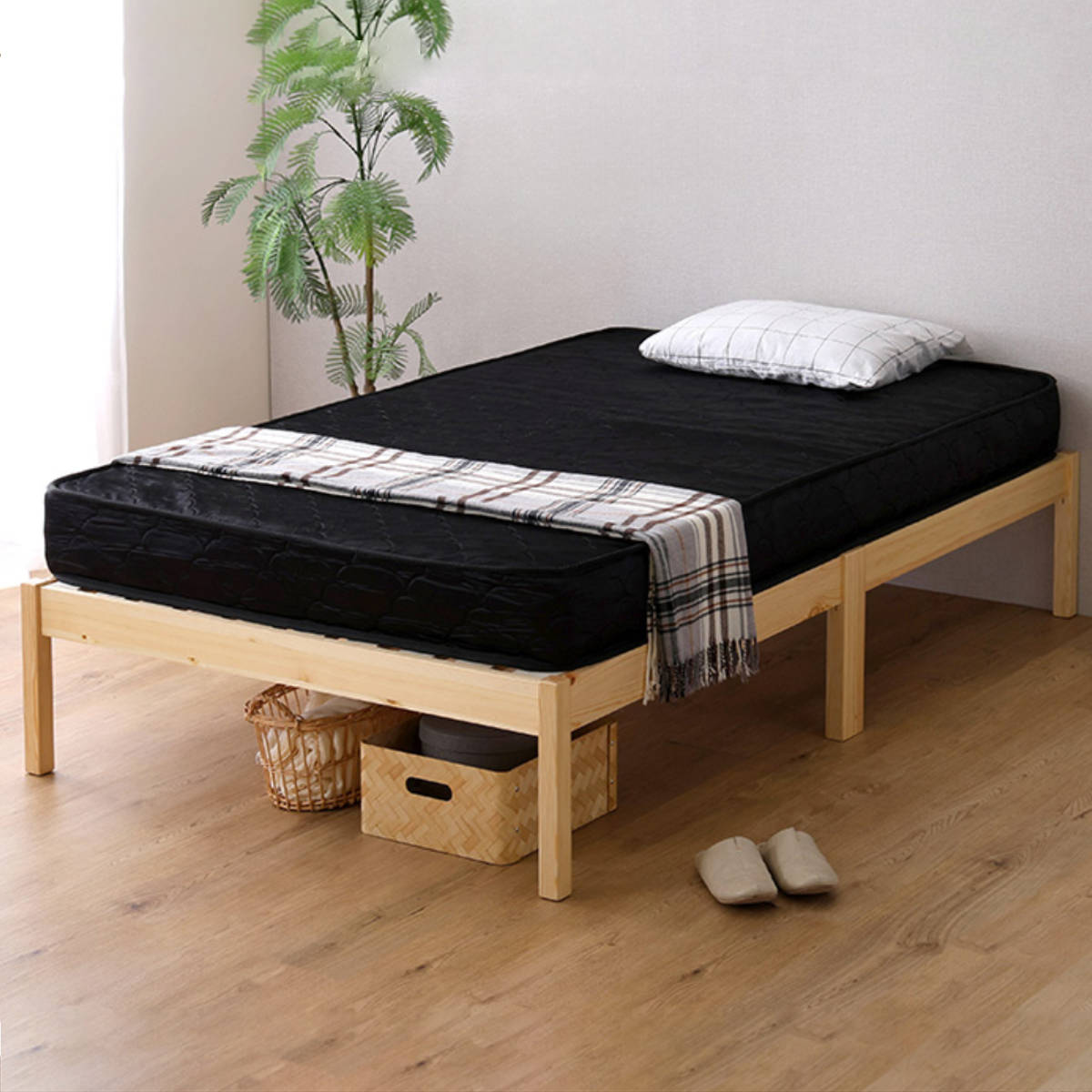 工具やネジを使わず、フレームを差し込み、すのこを木ダボにはめるだけの簡単設計。ベッドフレームが約2分で組み立て完了します。マットレスがセットになっているので、別々に選ぶ手間がなく、届いた日からすぐに快適な眠りを始められます。
