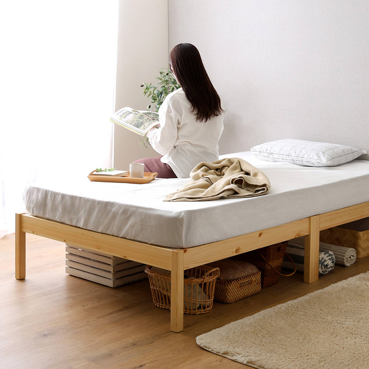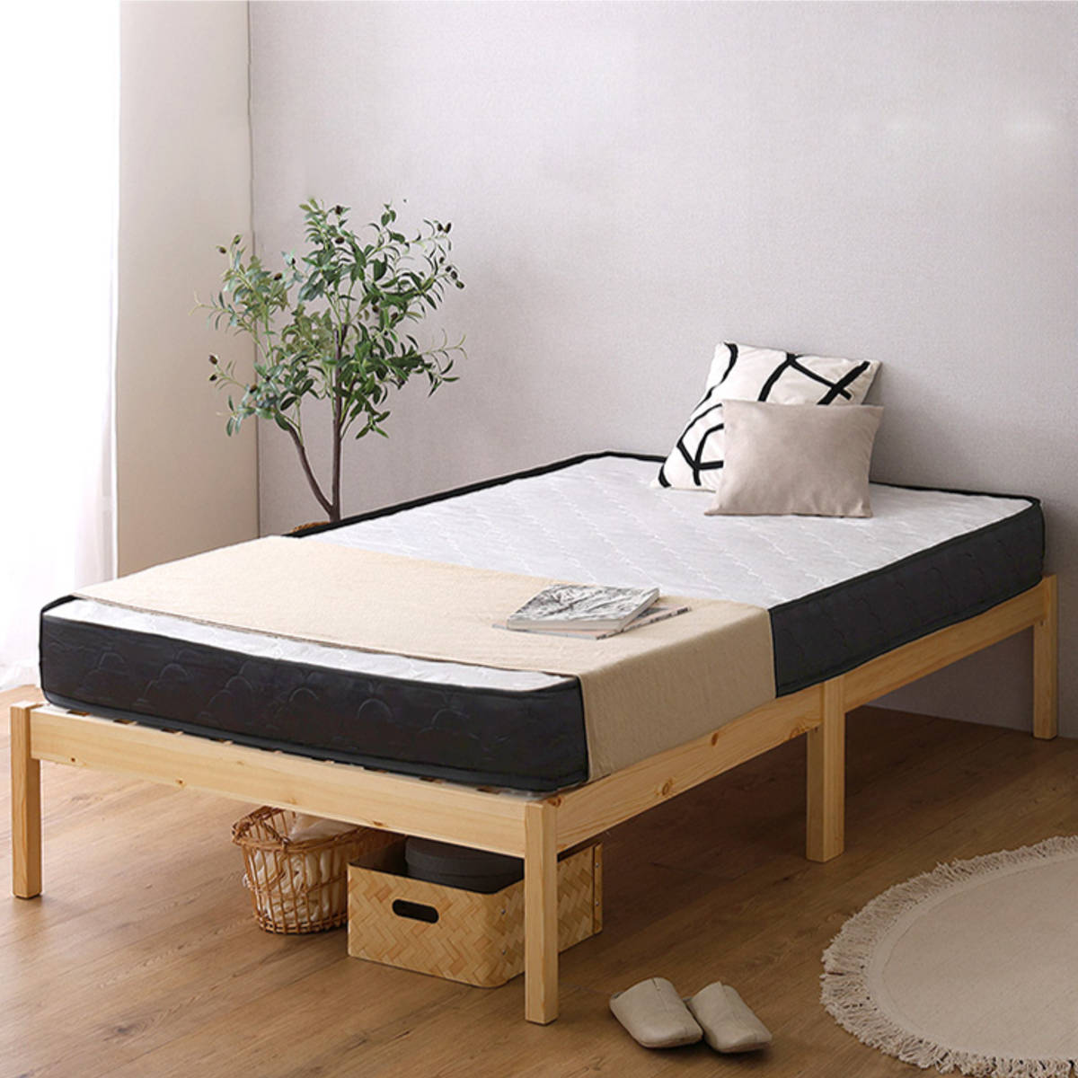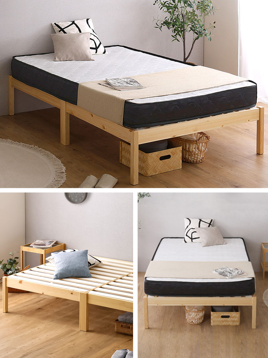 工具やネジを使わず、フレームを差し込み、すのこを木ダボにはめるだけの簡単設計。ベッドフレームが約2分で組み立て完了します。マットレスがセットになっているので、別々に選ぶ手間がなく、届いた日からすぐに快適な眠りを始められます。