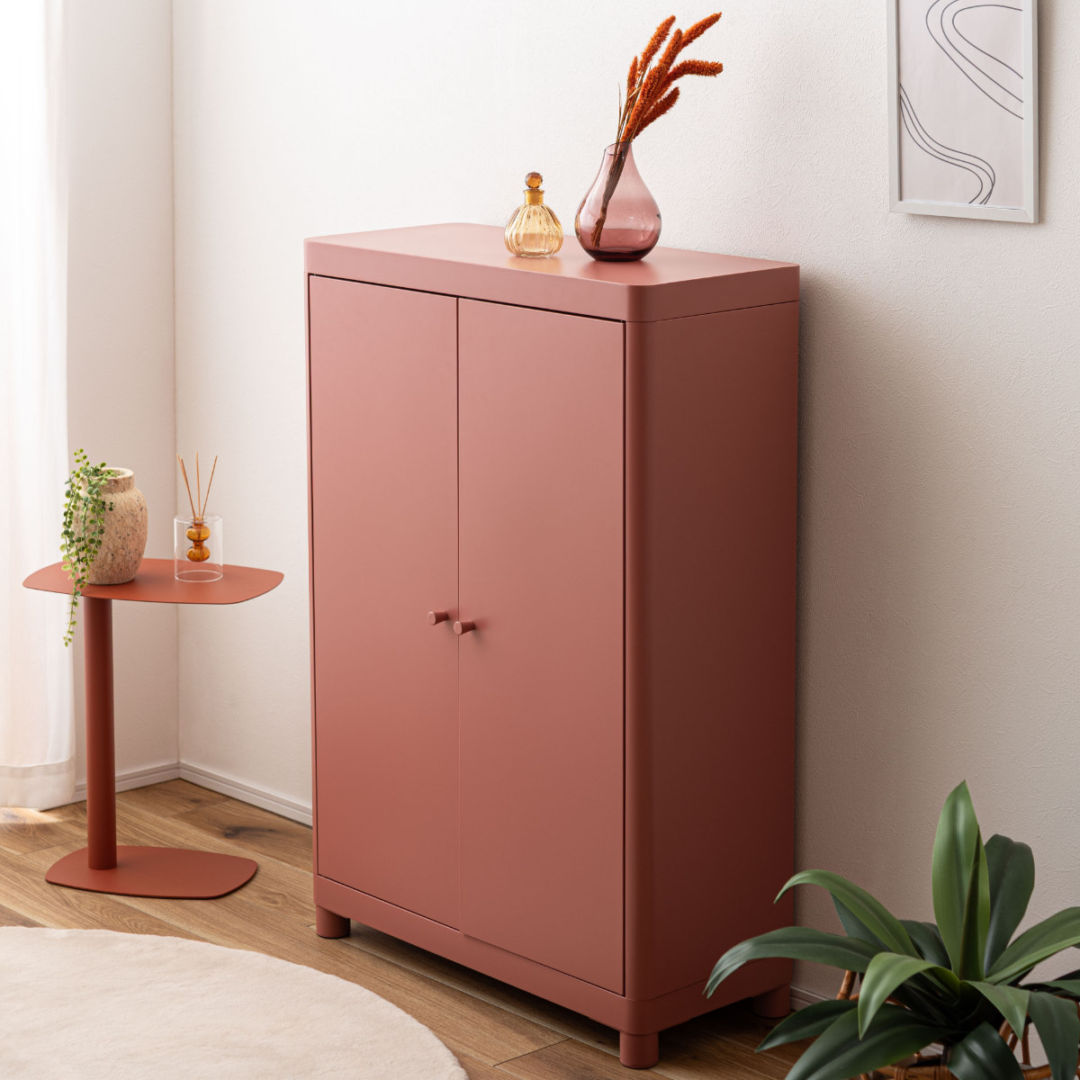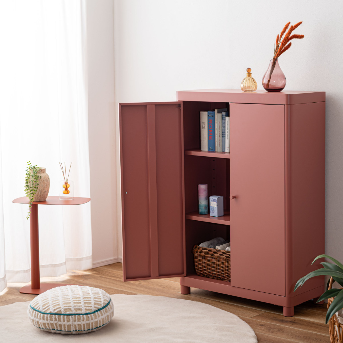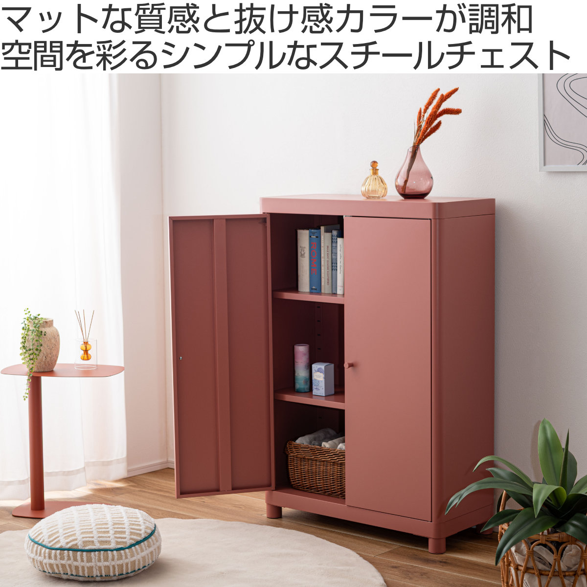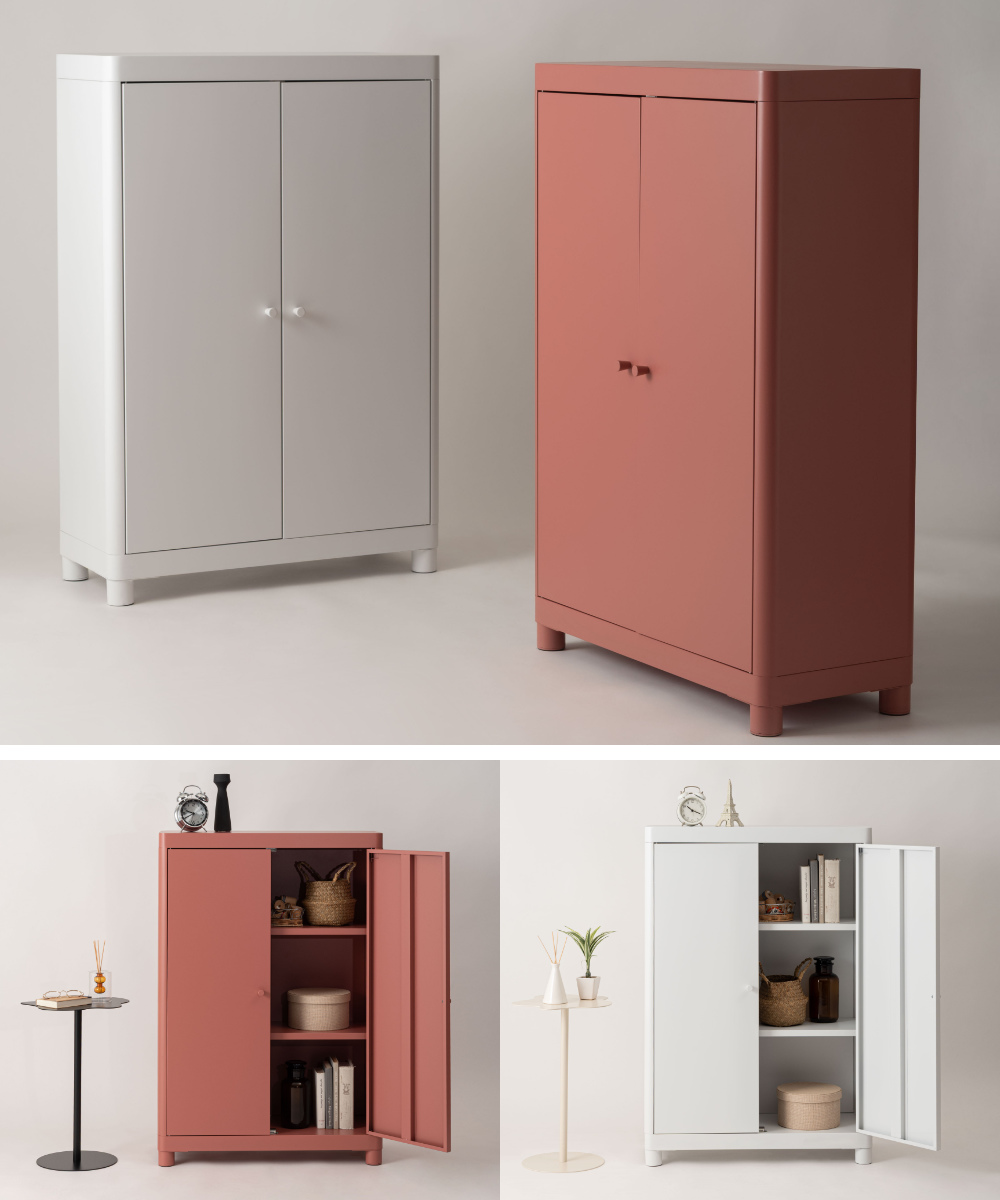無骨になりがちなスチール素材を、やわらかなトーンで仕上げ、垢抜けた印象に。空間になじみながら、さりげなく彩りを添えます。