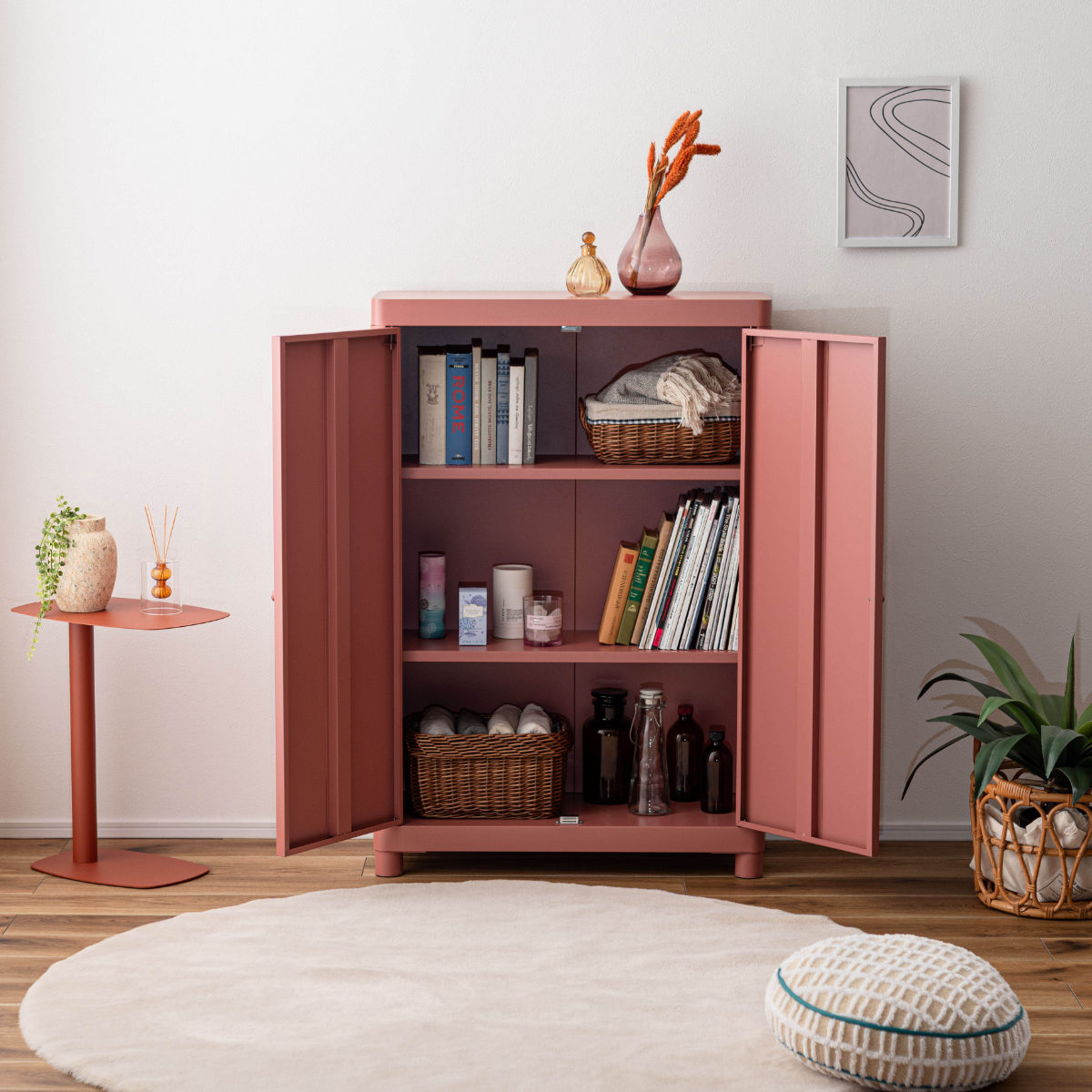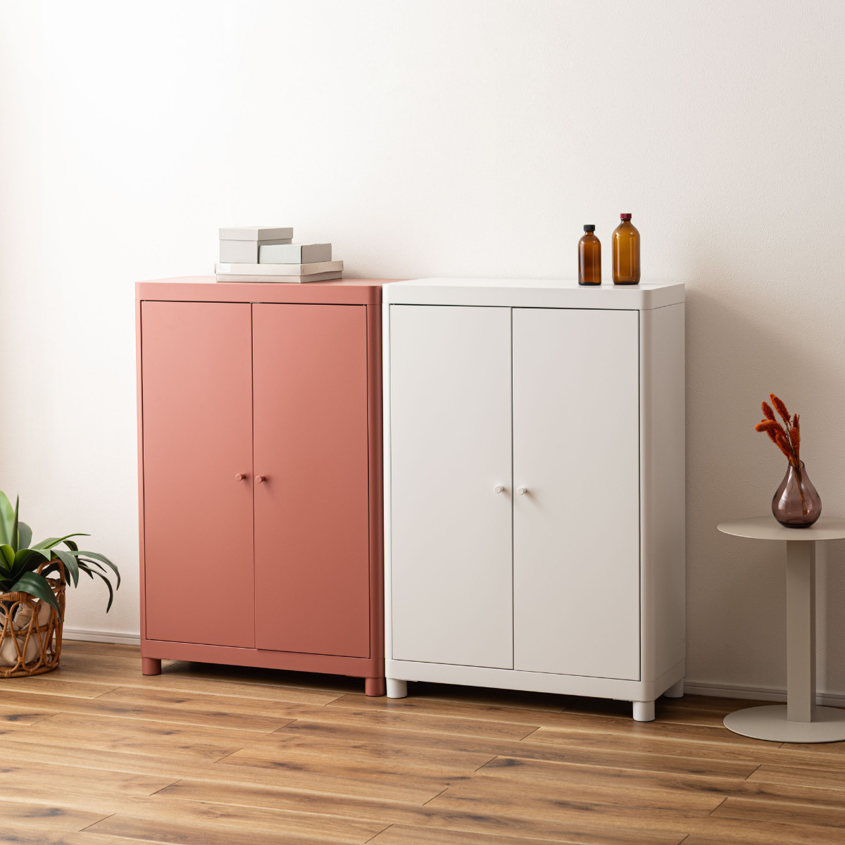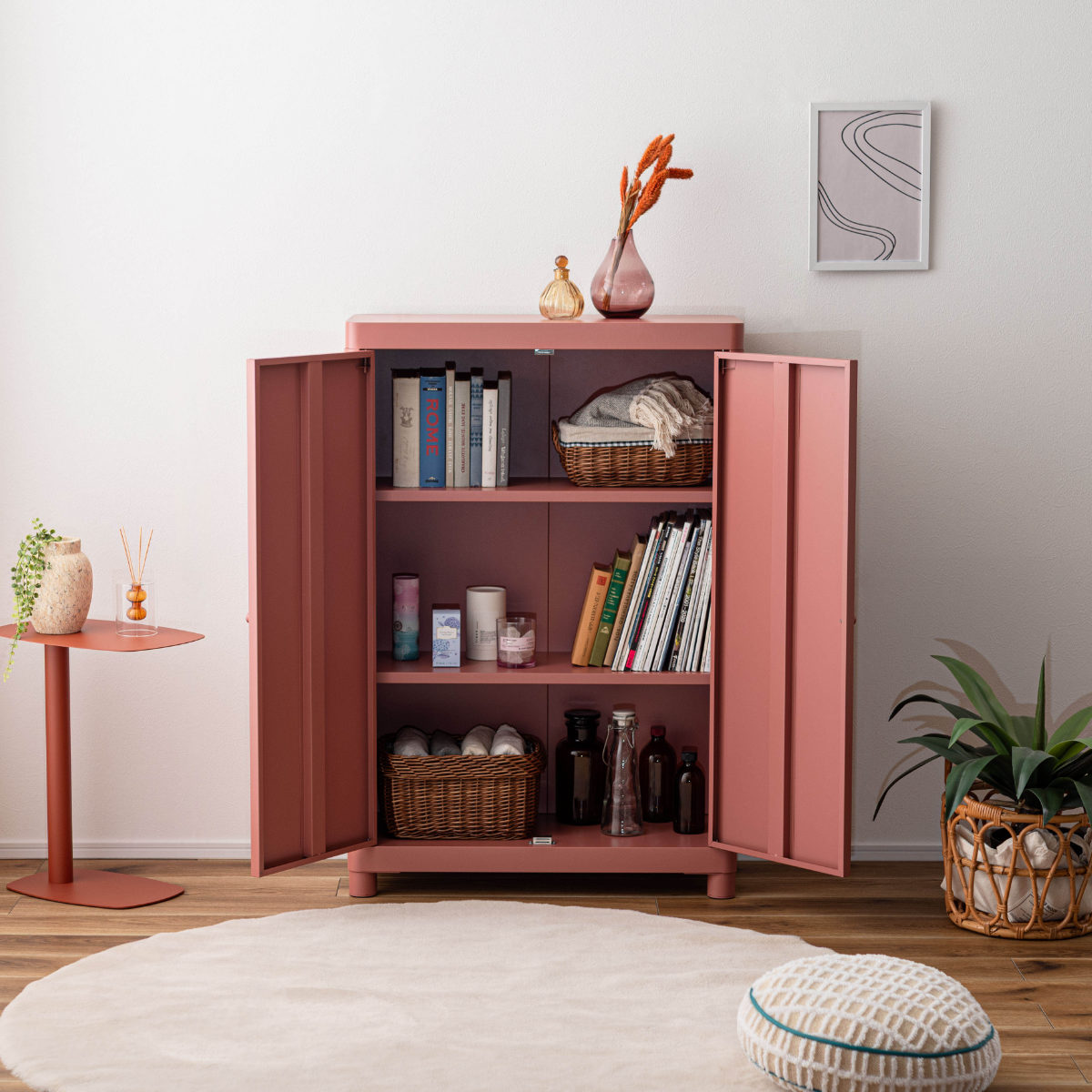 無骨になりがちなスチール素材を、やわらかなトーンで仕上げ、垢抜けた印象に。空間になじみながら、さりげなく彩りを添えます。