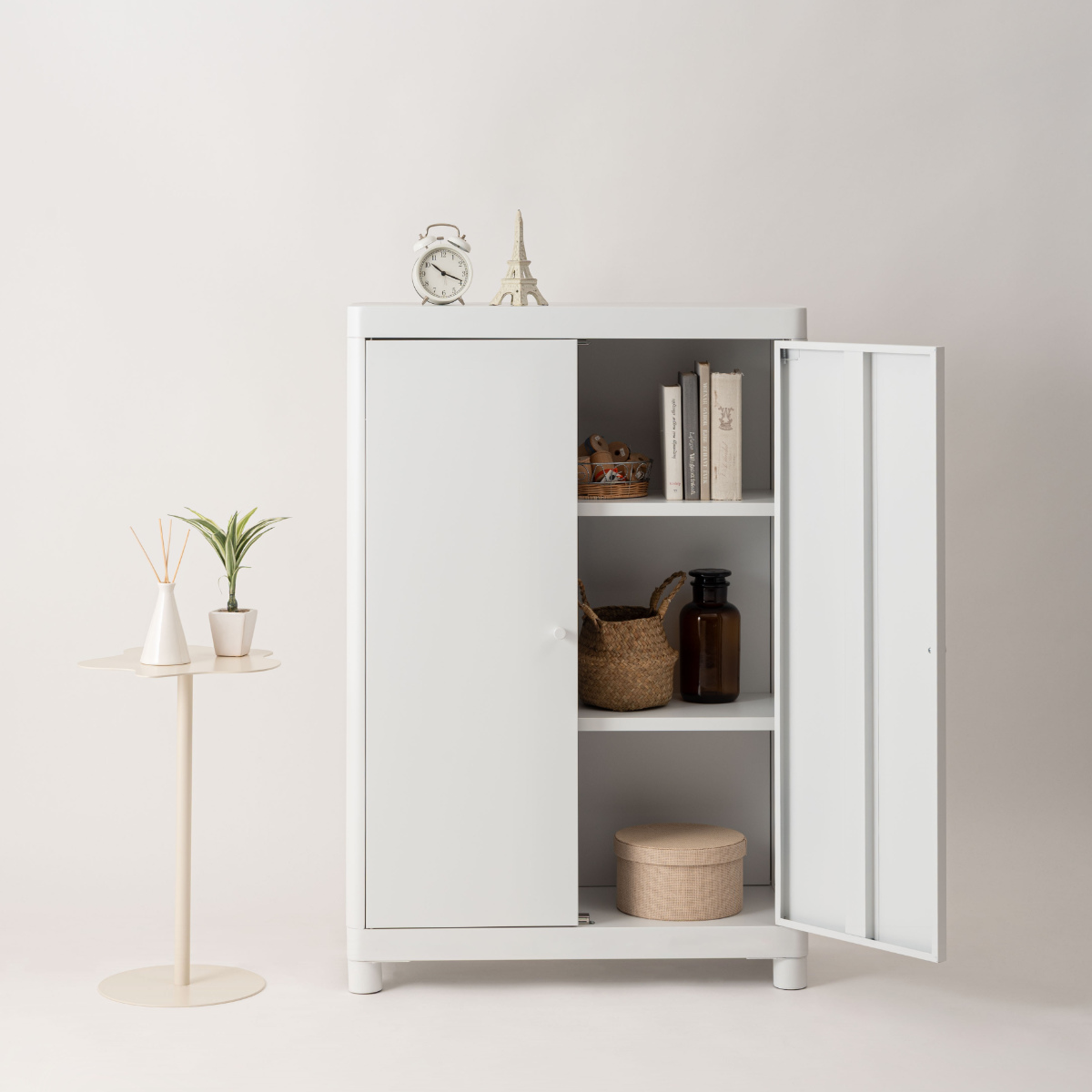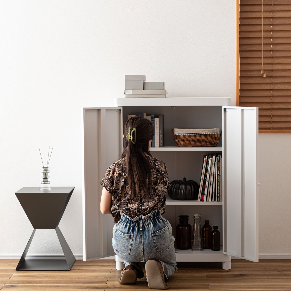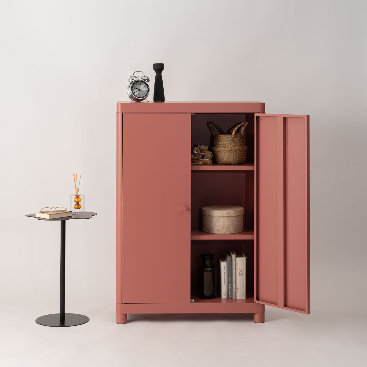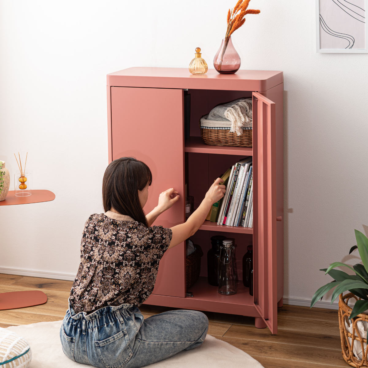 無骨になりがちなスチール素材を、やわらかなトーンで仕上げ、垢抜けた印象に。空間になじみながら、さりげなく彩りを添えます。