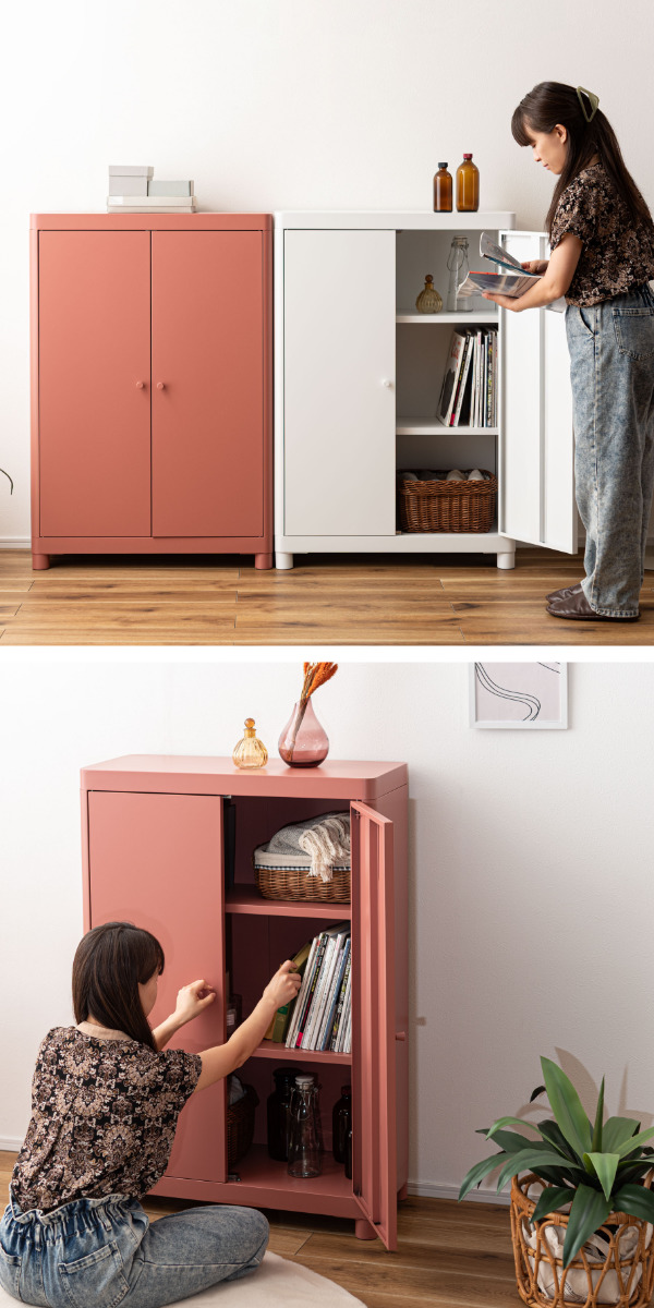 扉はマグネットキャッチ式で、ぴたっと閉まる仕様。中身が見えず、安心して収納できます。
