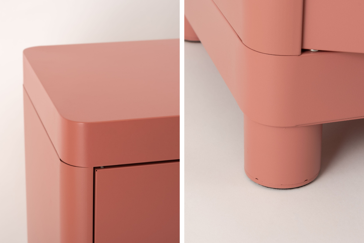 角や脚を丸く仕上げたフォルムが、スチールの印象をやわらげ、空間にやさしくなじみます。