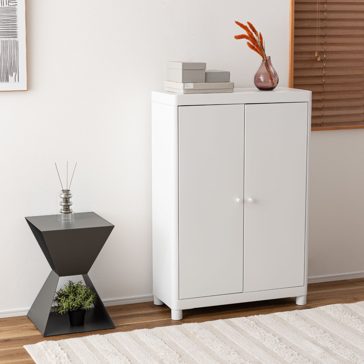 光沢を抑えたマットなスチールが、シンプルモダンな印象を与えるチェストです。可動式3段の収納棚で、デザイン性だけでなくしっかり収納力も備えています。
