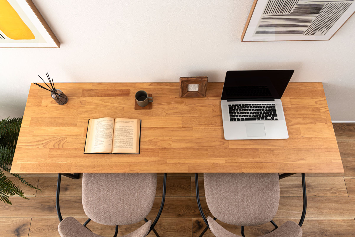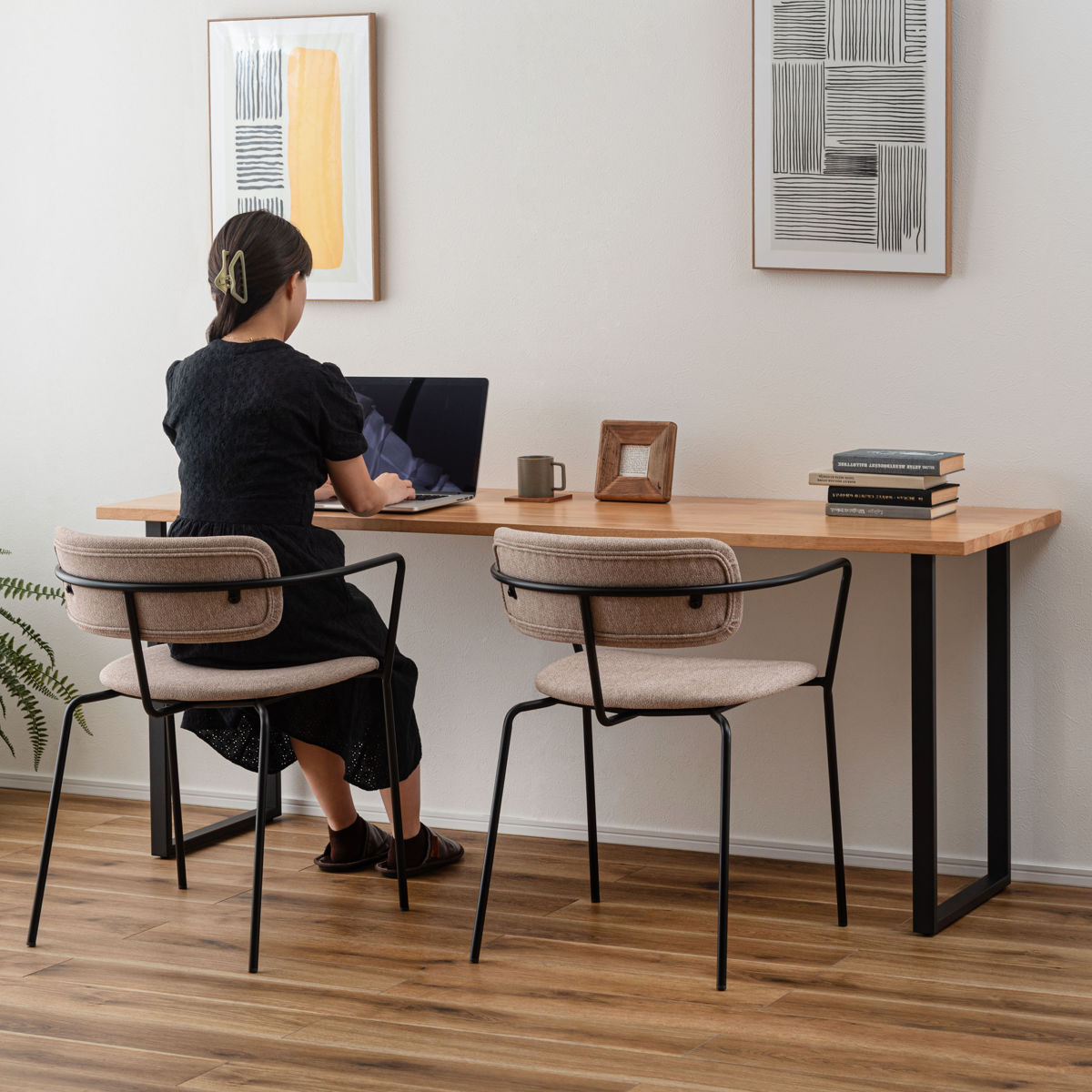 ダイニングテーブルとしてだけでなく、壁に沿わせて設置すればワークスペースとしても快適に使えます。食事の時間も作業の時間もこれ1台で対応可能です。