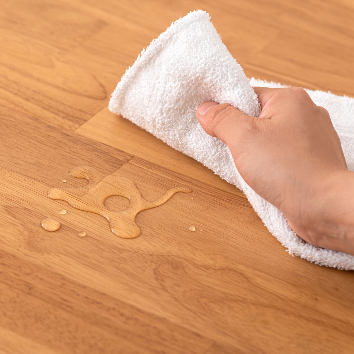 天板にはウレタン塗装を施しているので、汚れてしまってもサッと拭きとれます。透明感のある塗膜で、天然木の美しさを引き立てながら耐久性と防汚性を高めています。