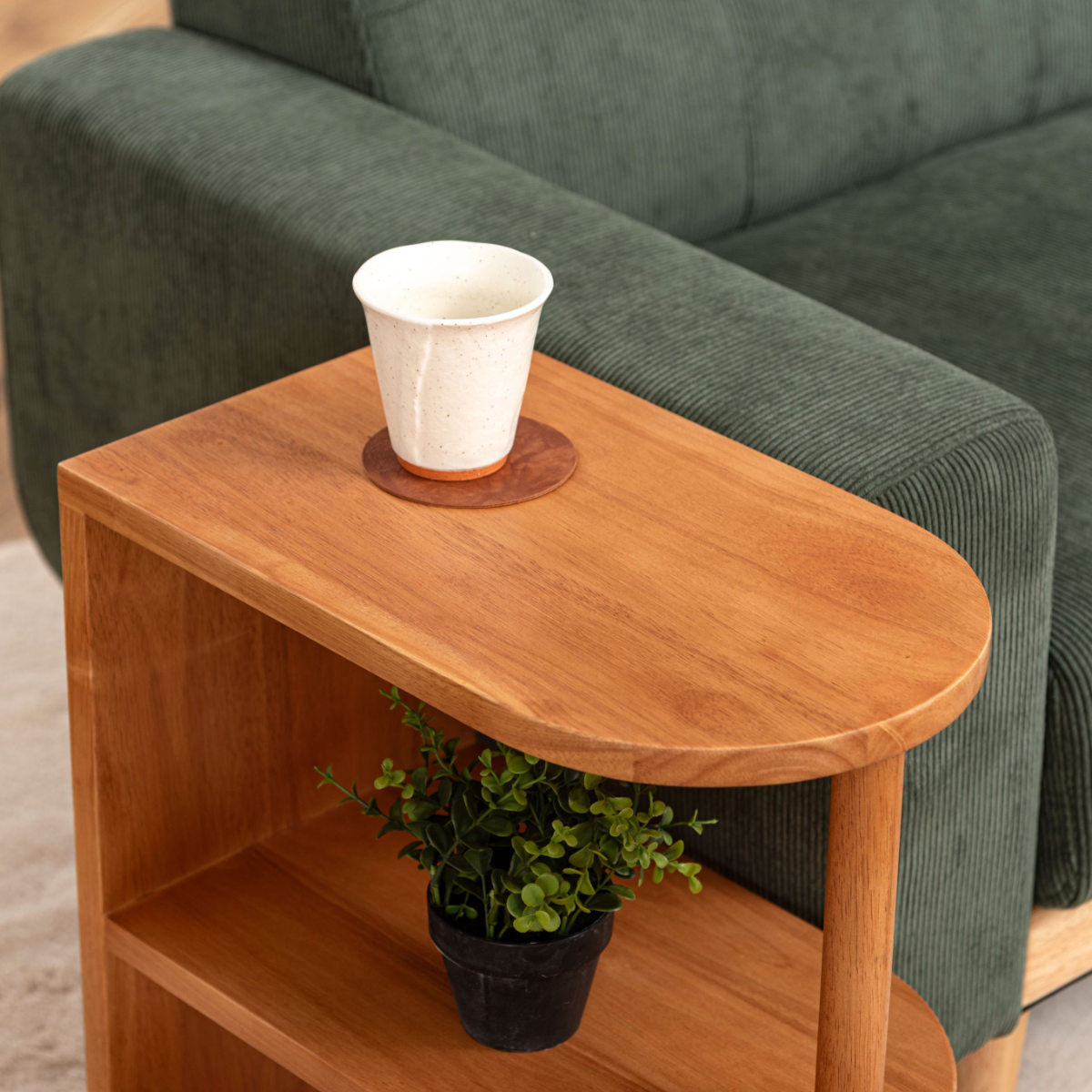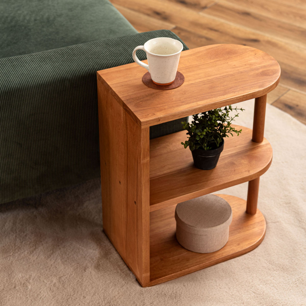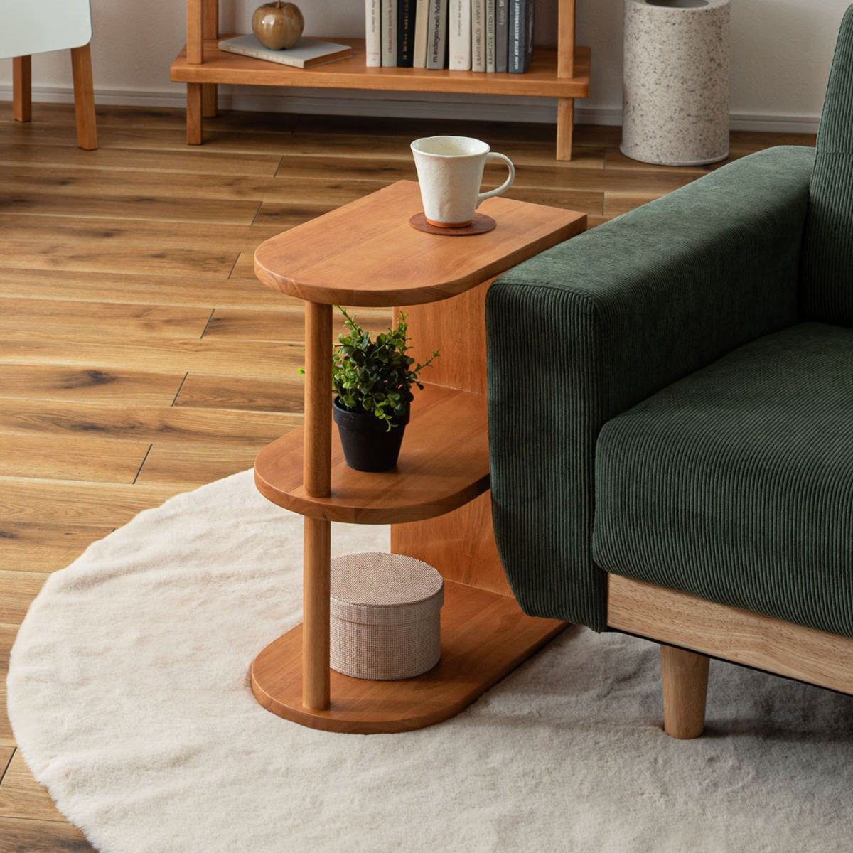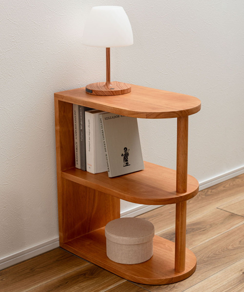サイドテーブルとしての実用性はもちろん、下段は収納やディスプレイラックとして活用できます。よく使うものを手元に置きながら、お気に入りを飾る楽しさも広がります。