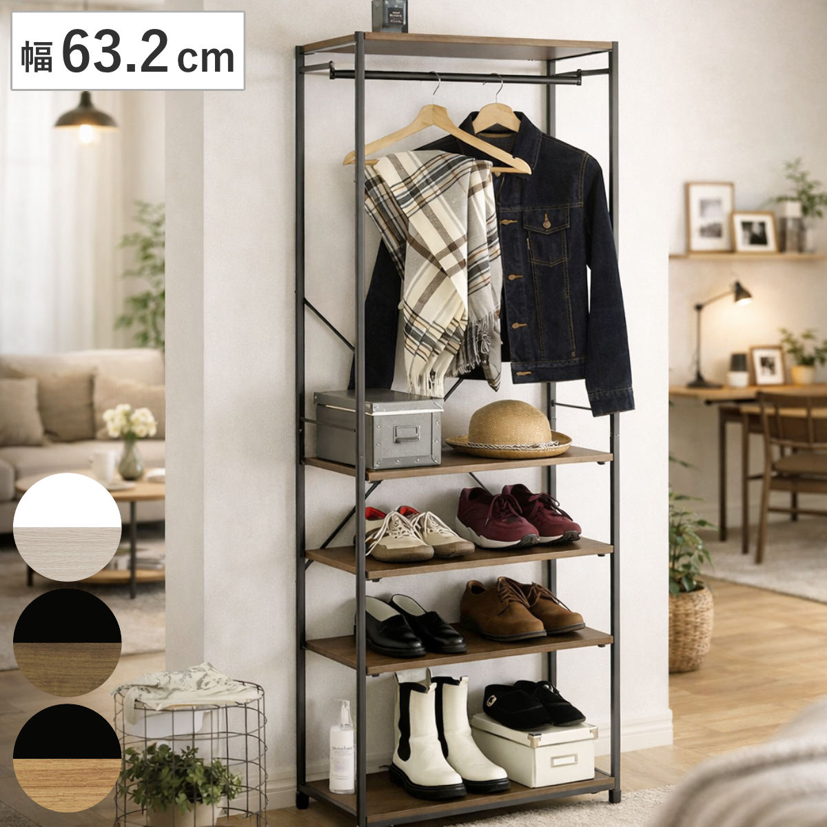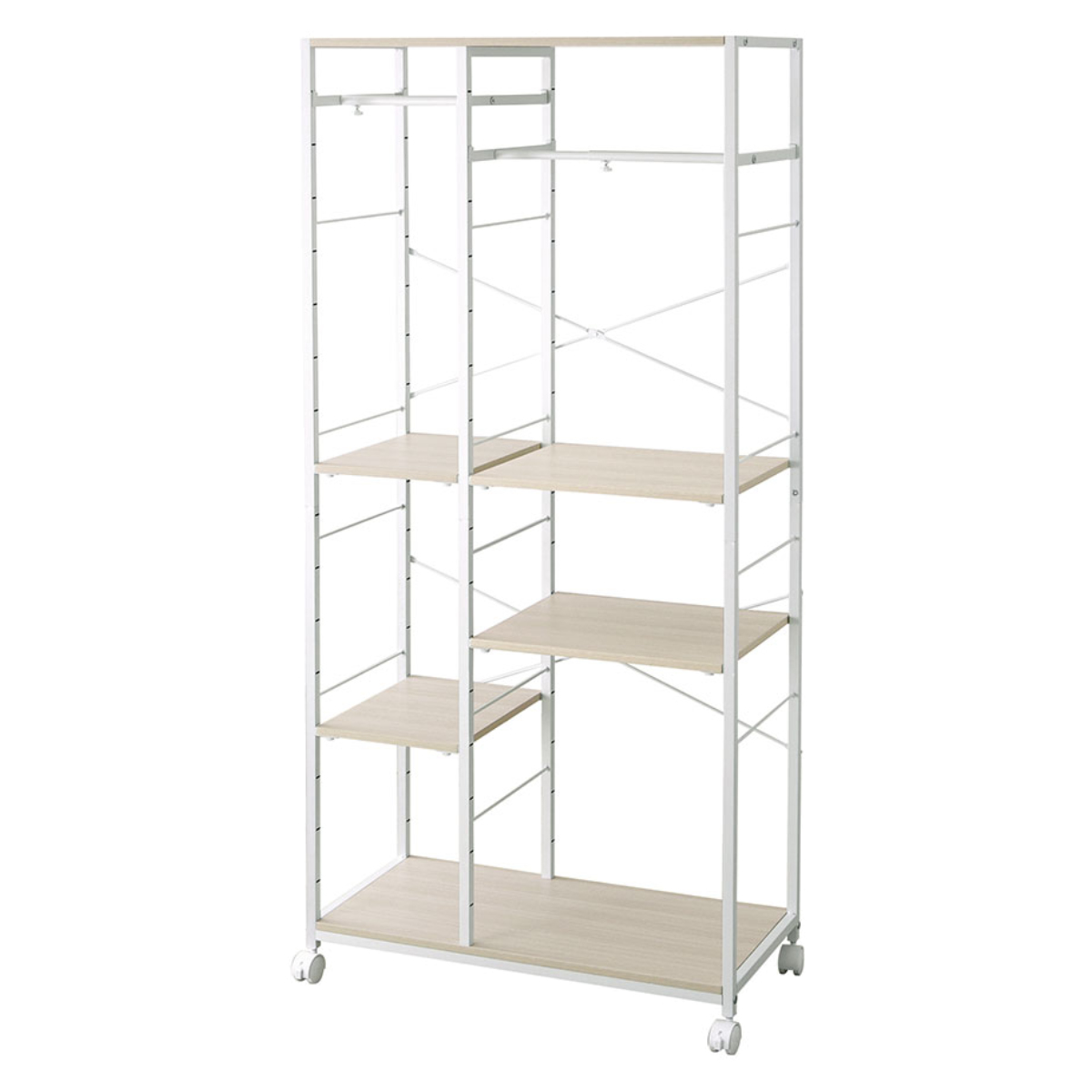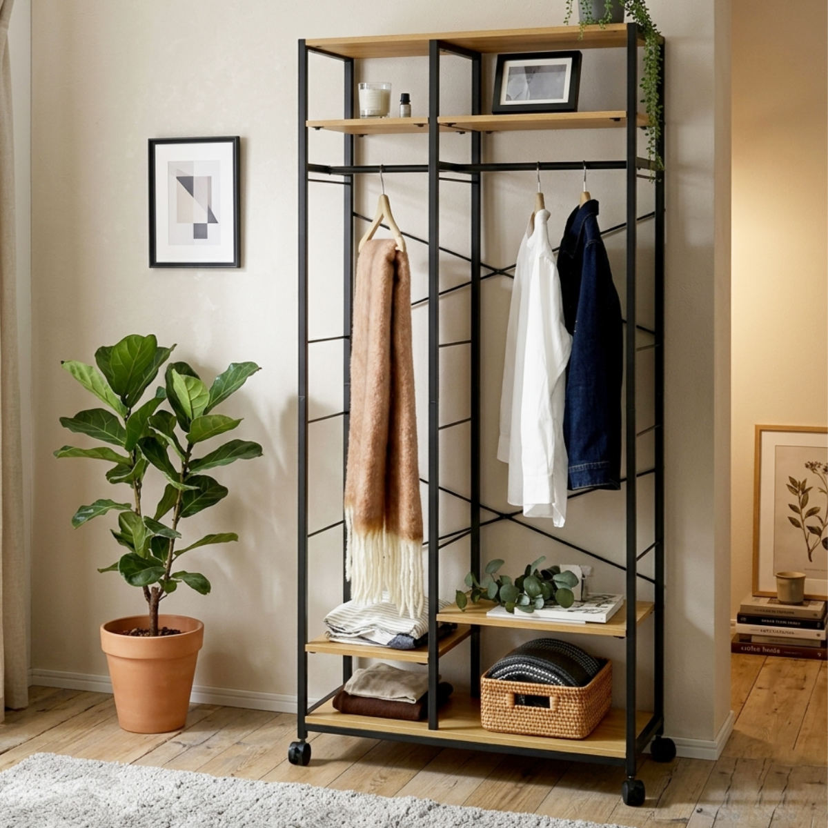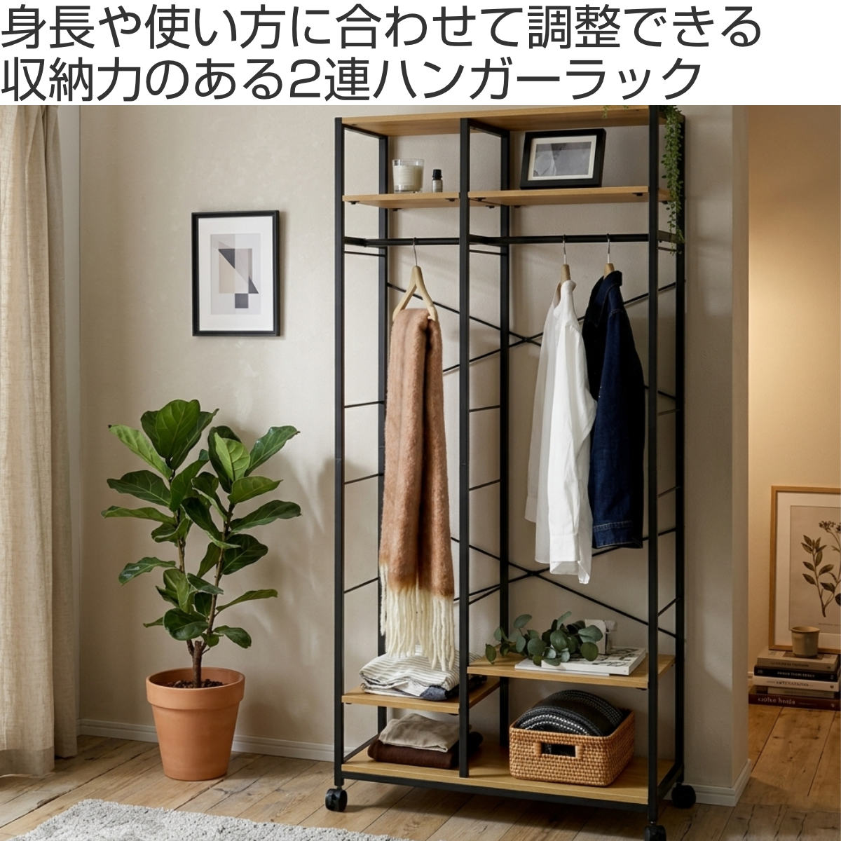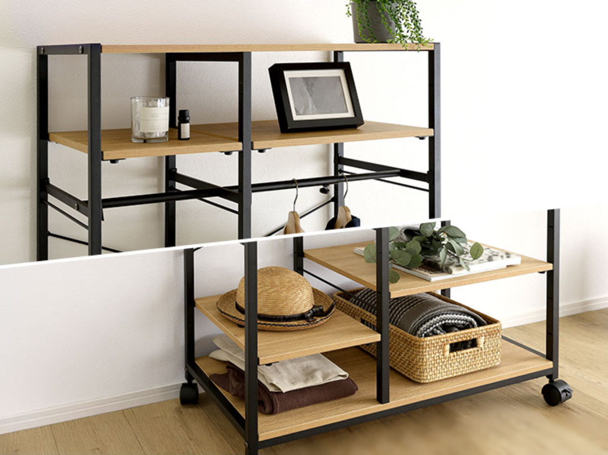 衣類だけでなく、帽子やバッグ、雑貨などの小物収納にも便利です。棚板は簡単に位置調整ができるので、スペースを無駄なく活かした収納が可能です。必要なものにさっと手が届き、毎日の身支度もスムーズに行えます。