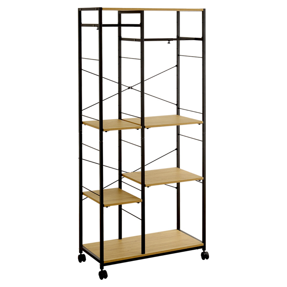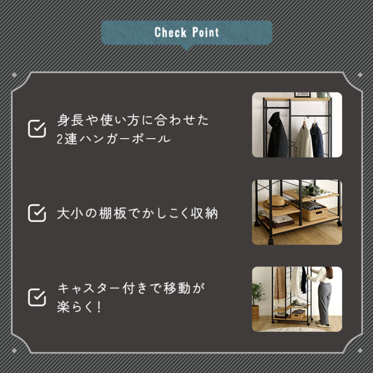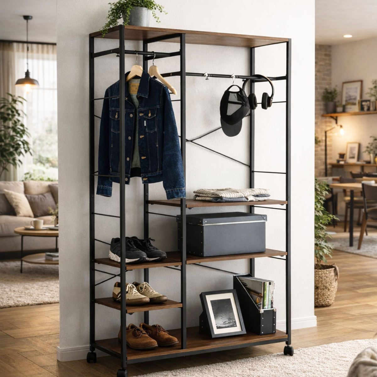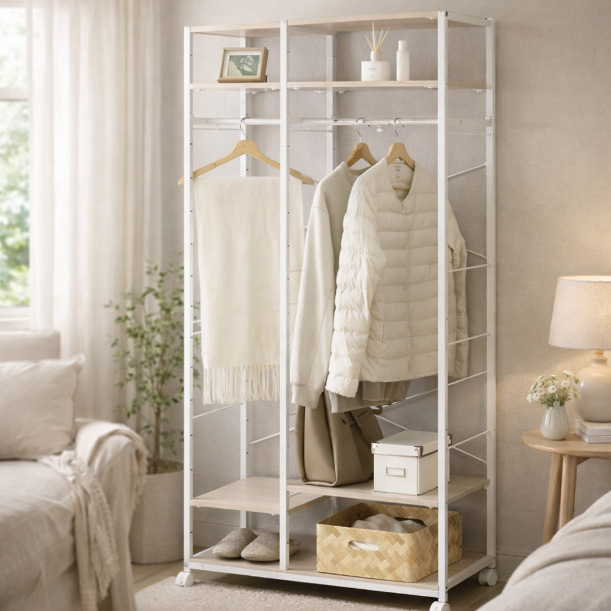 衣類だけでなく、帽子やバッグ、雑貨などの小物収納にも便利です。棚板は簡単に位置調整ができるので、スペースを無駄なく活かした収納が可能です。必要なものにさっと手が届き、毎日の身支度もスムーズに行えます。