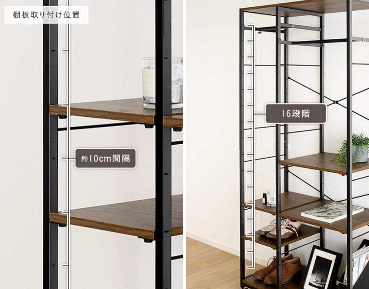各棚板は10cm間隔で高さ調整が可能です。棚板はフレームにしっかり固定する仕様で、安定した使い心地です。天板と底板は安全にお使いいただくため固定棚となっています。
