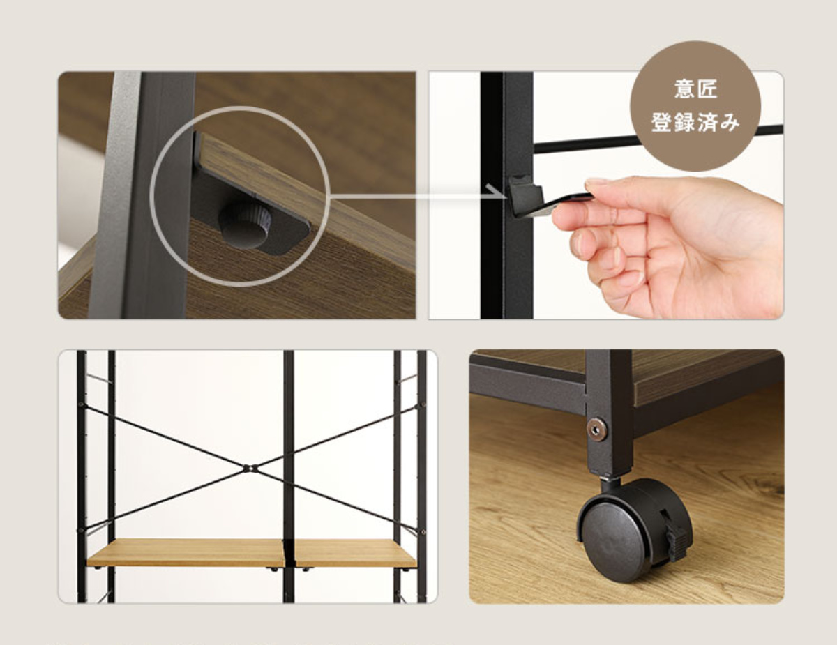 可動棚は、引っ掛けるだけのタイプと異なり、専用パーツでしっかり固定できる仕様です。棚がずれ落ちる心配がなく安心してお使いいただけます。さらに筋交いを備えることで、製品のゆがみも抑えています。