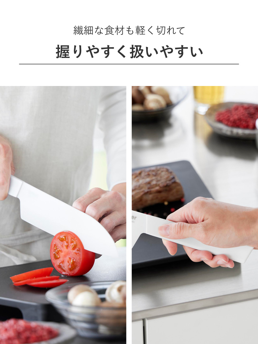 | 材質 | 刃材:ジルコニアセラミック (刃付け形状/両刃付け) ハンドル:耐熱ポリプロピレン |