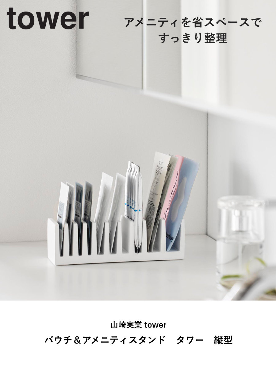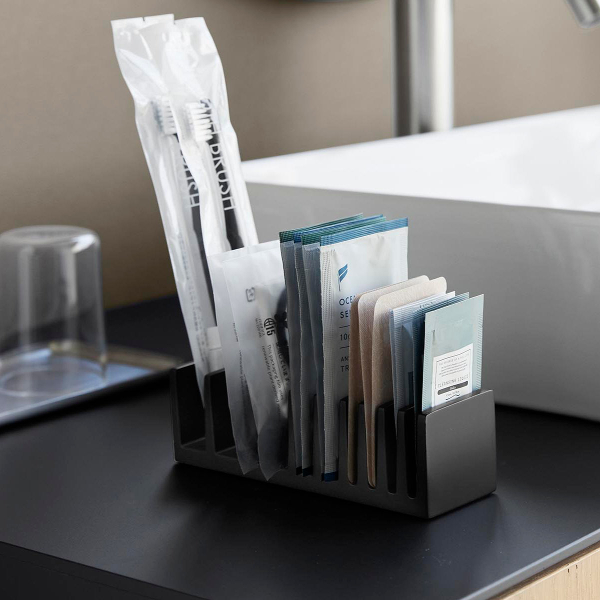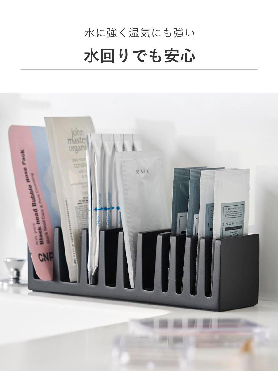 スリムで省スペース設計のため、洗面所やドレッサー、バスルームの棚、ホテルのアメニティコーナーなど、限られた場所でも効率よく設置可能です。歯ブラシやコットンなどのアメニティグッズも分類して整理しやすくなっています。