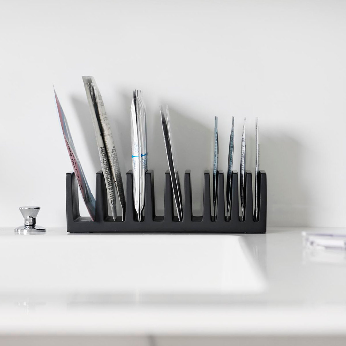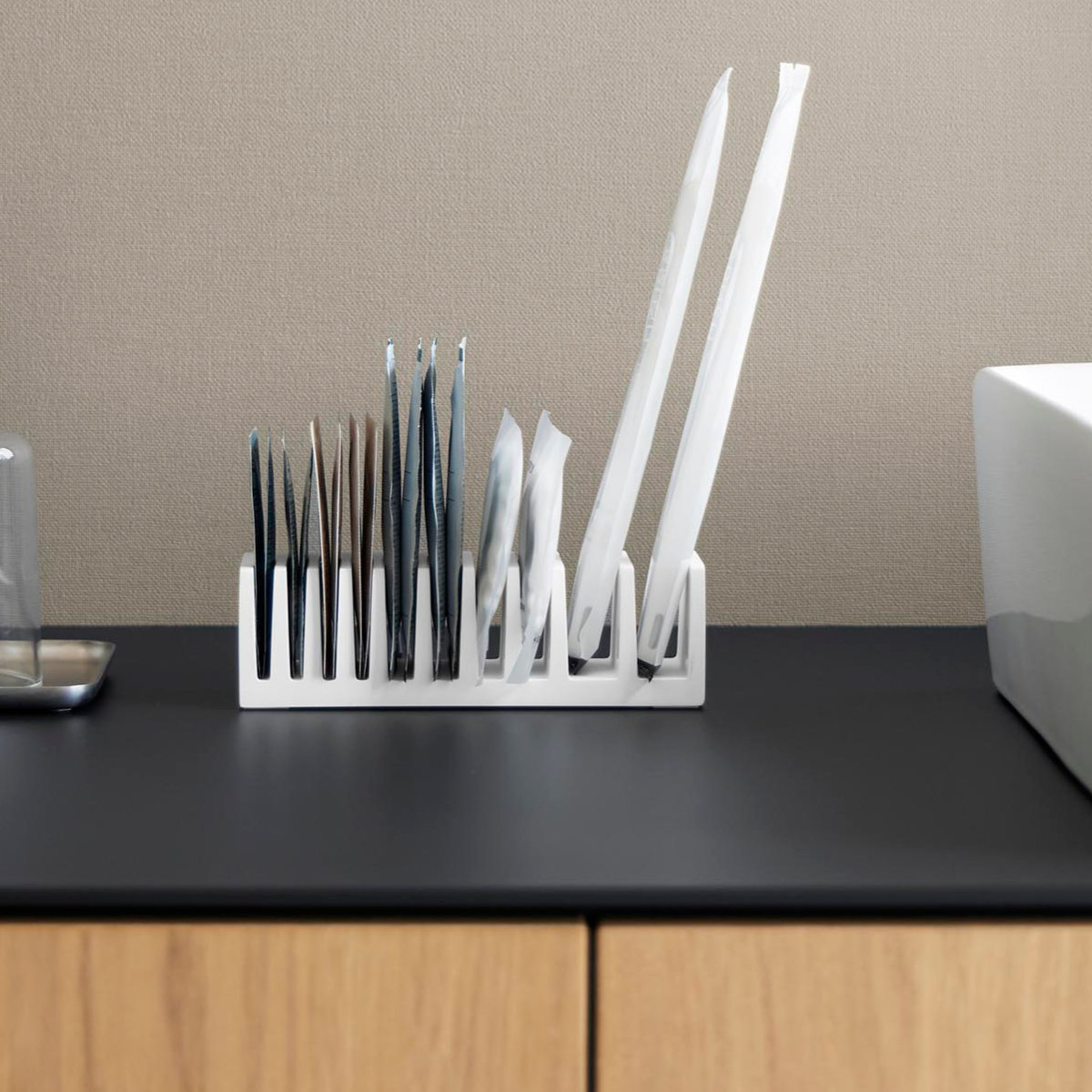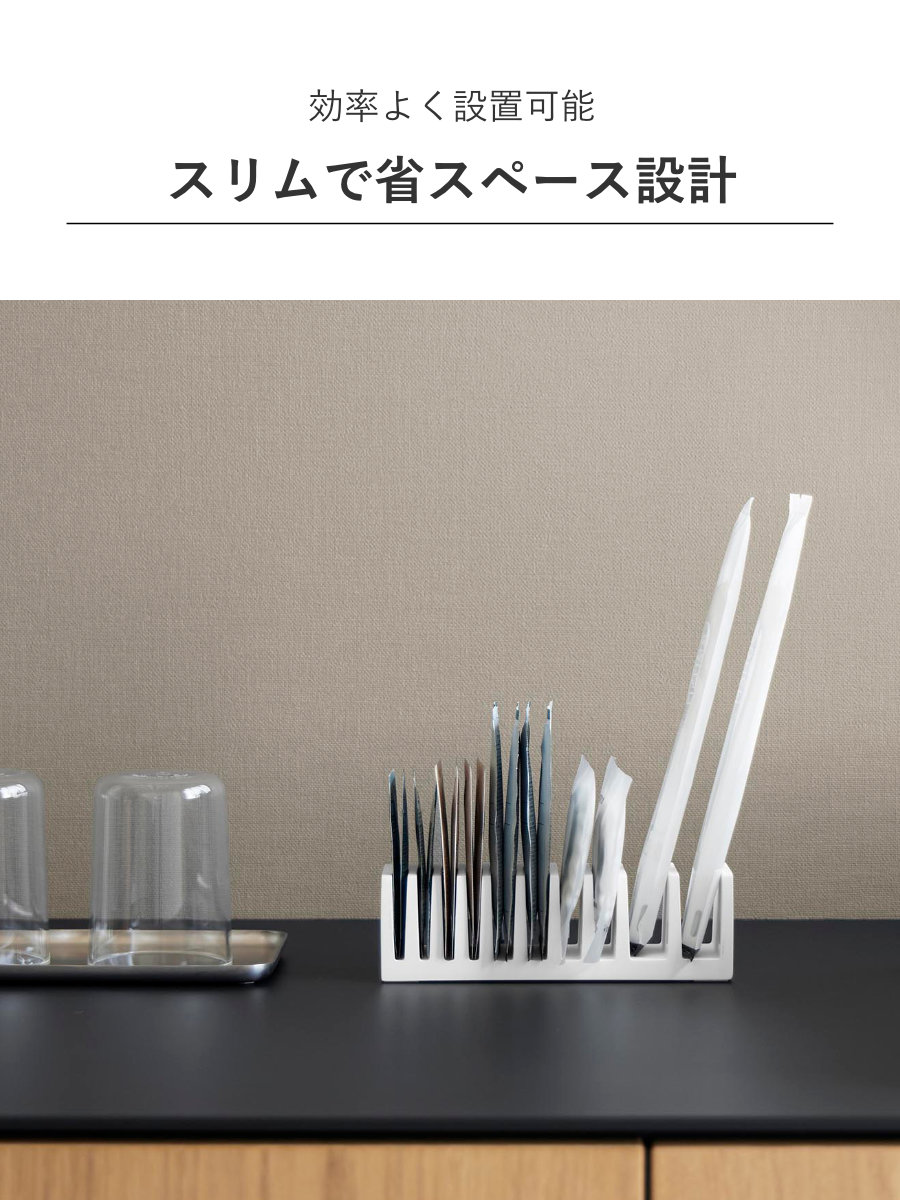 スリムで省スペース設計のため、洗面所やドレッサー、バスルームの棚、ホテルのアメニティコーナーなど、限られた場所でも効率よく設置可能です。歯ブラシやコットンなどのアメニティグッズも分類して整理しやすくなっています。