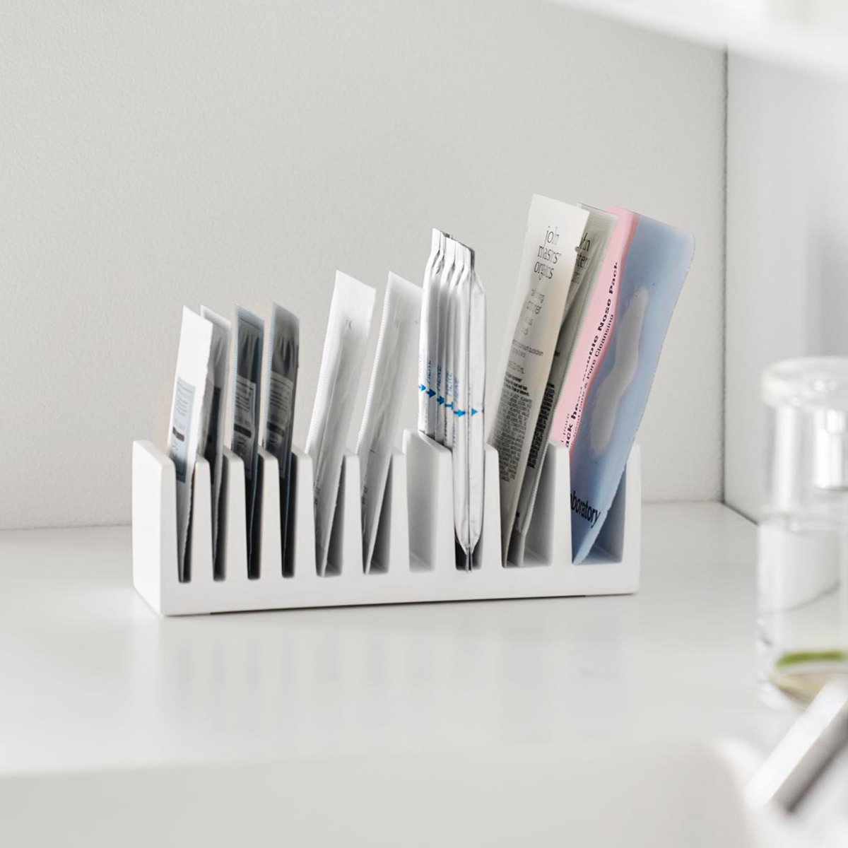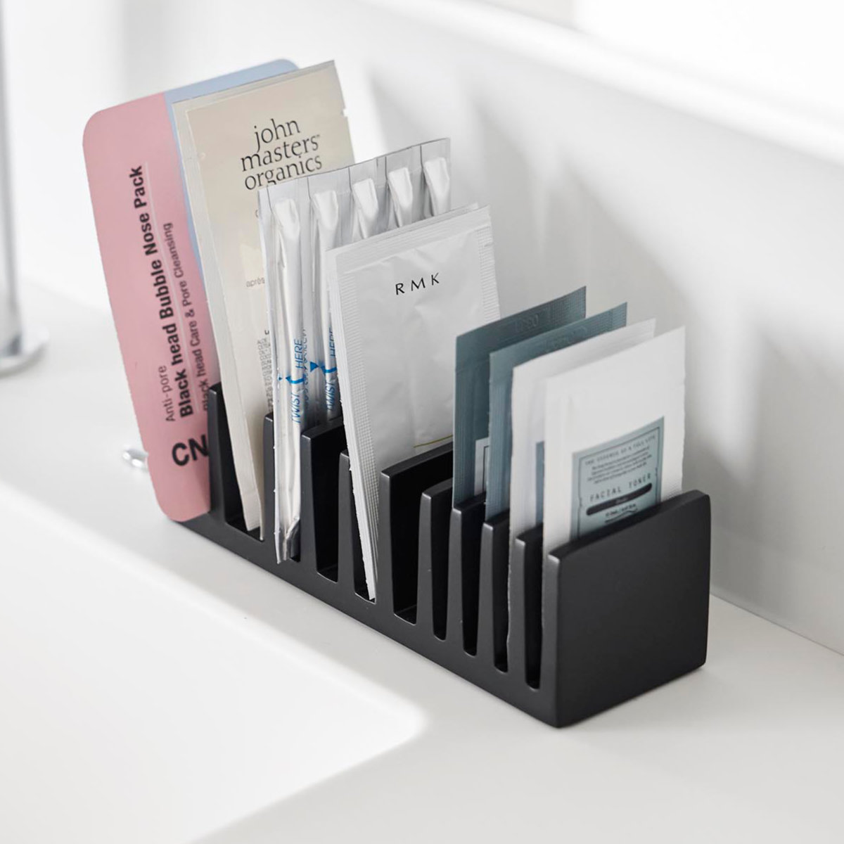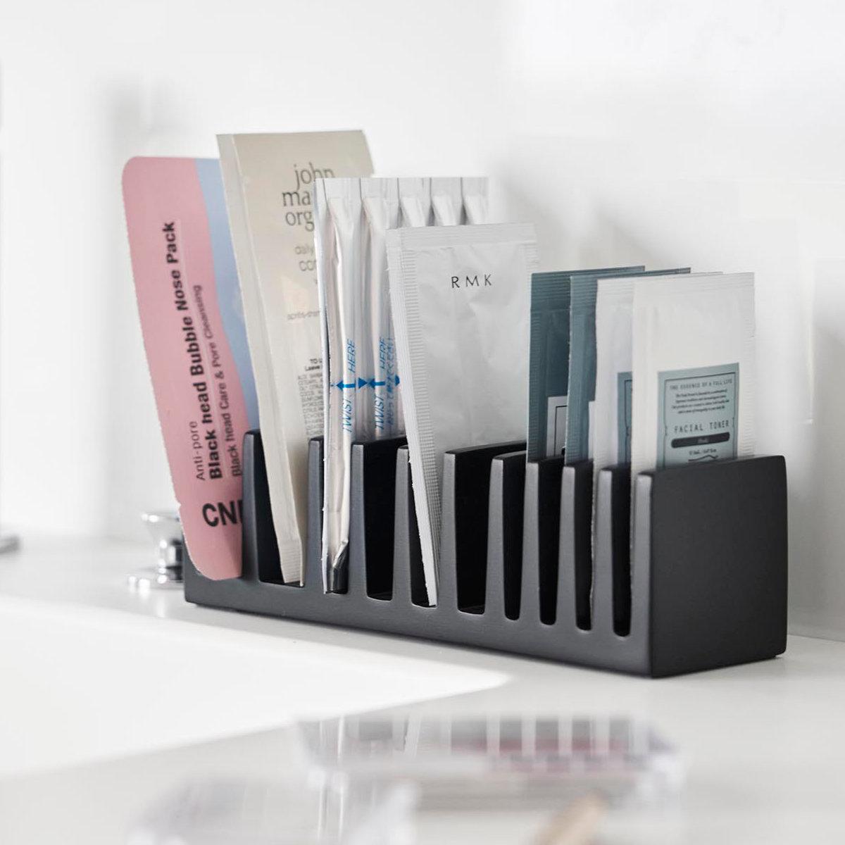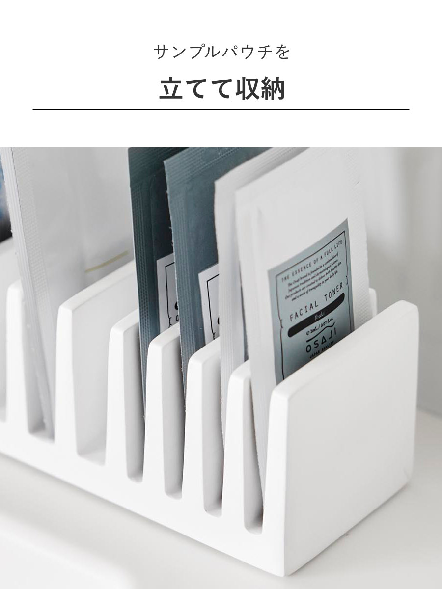 化粧品や試供品のサンプルパウチを立てて収納できる、便利なパウチスタンドです。立てて整理することで、散らかりがちな小さなパウチ類もすっきり整頓でき、必要なものを一目で取り出せます。