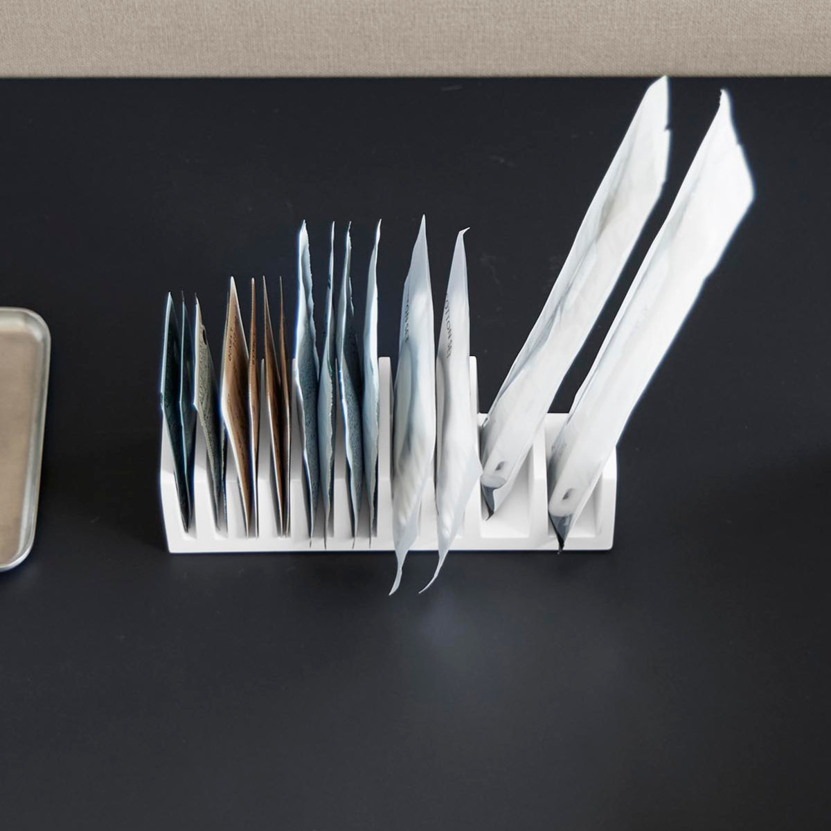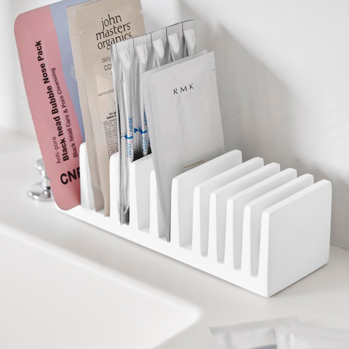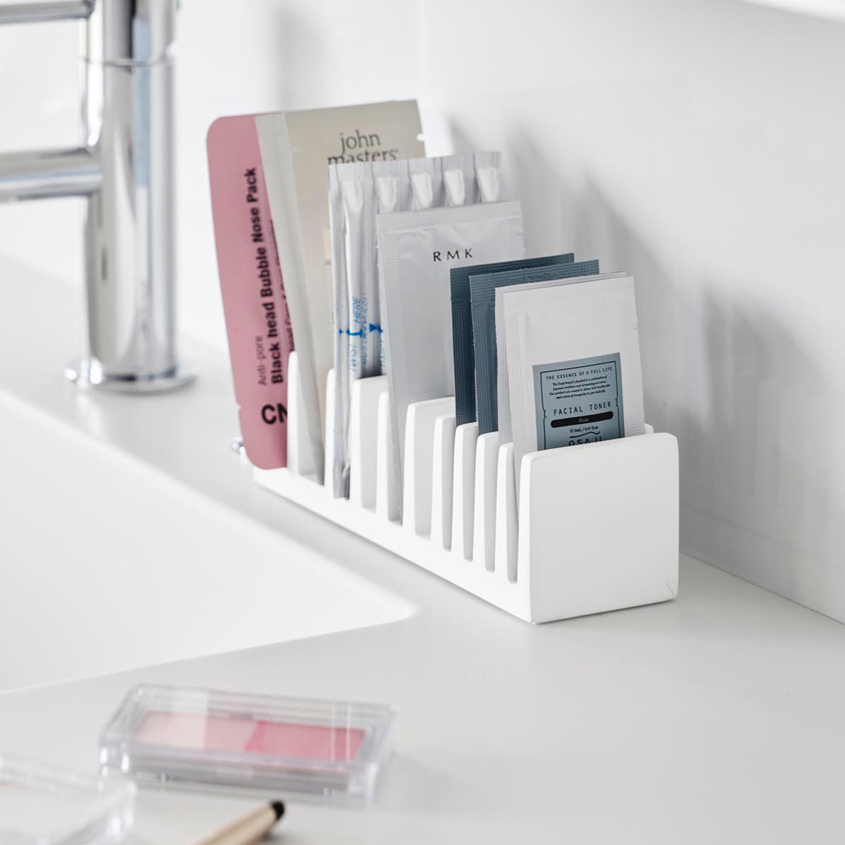化粧品や試供品のサンプルパウチを立てて収納できる、便利なパウチスタンドです。立てて整理することで、散らかりがちな小さなパウチ類もすっきり整頓でき、必要なものを一目で取り出せます。
