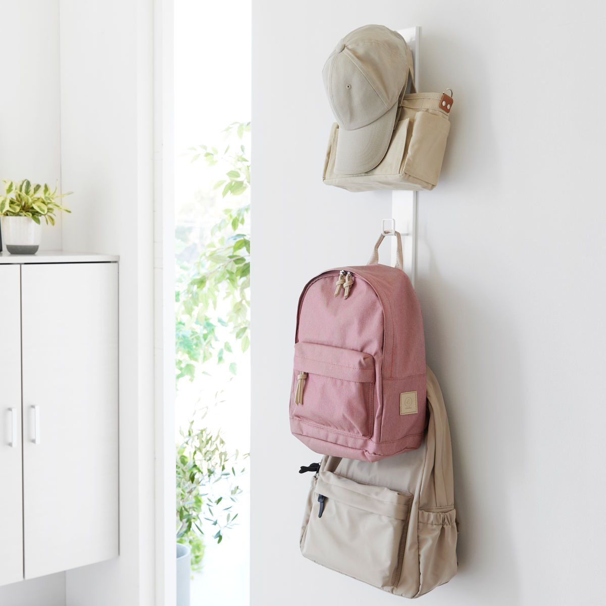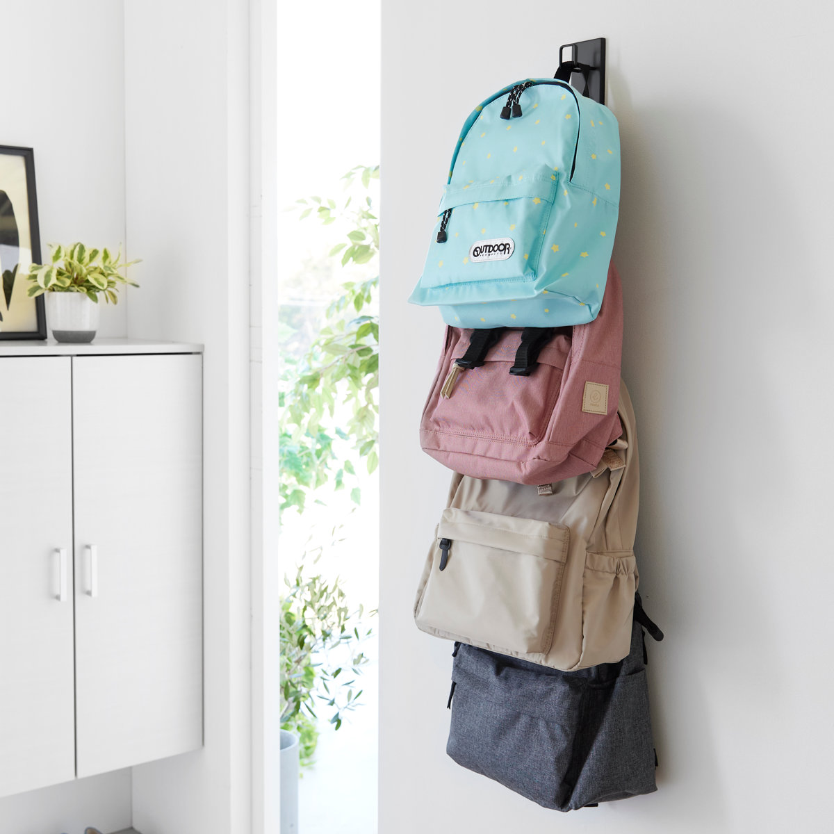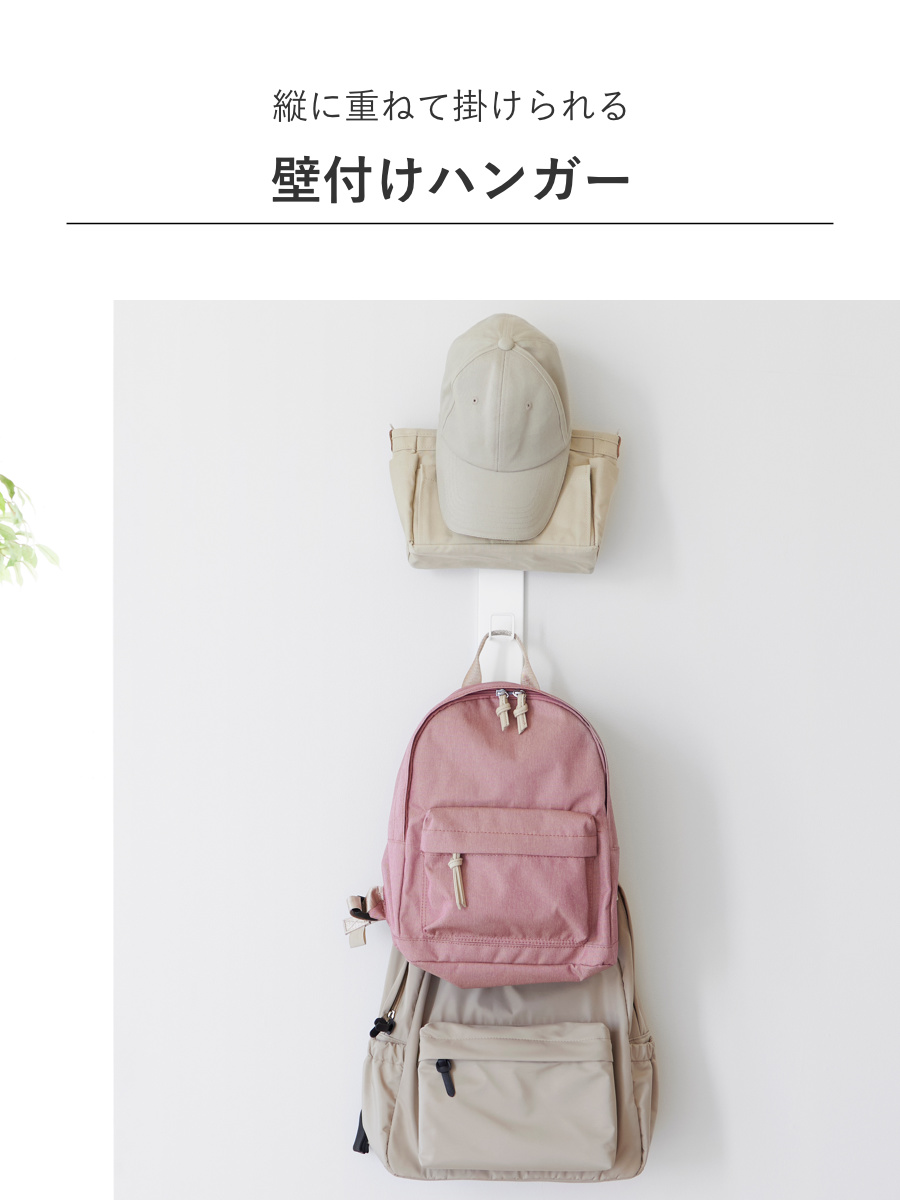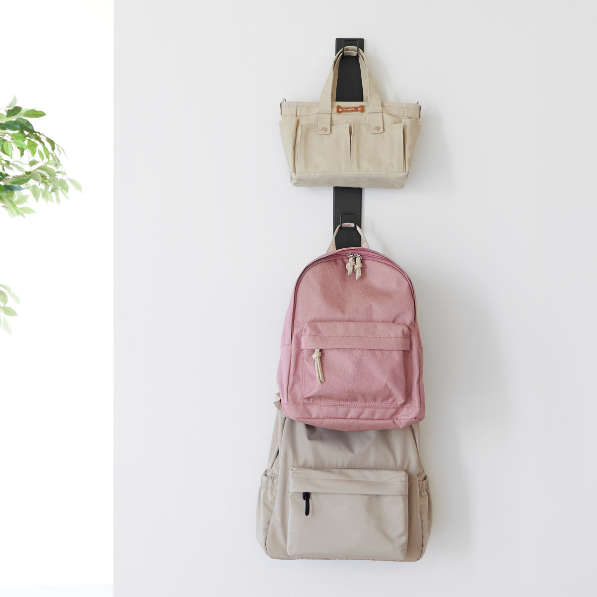 縦型の壁付けハンガーです。収納に困りがちなリュックなどを縦に重ねて掛けられ、省スペースに収納できます。