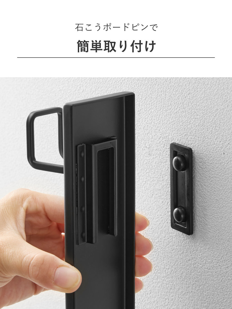 壁の穴が目立ちにくい石こうボードピンで、簡単に取り付けできます。ピンで固定した取り付けベースに本体を差し込むだけで、設置完了です。