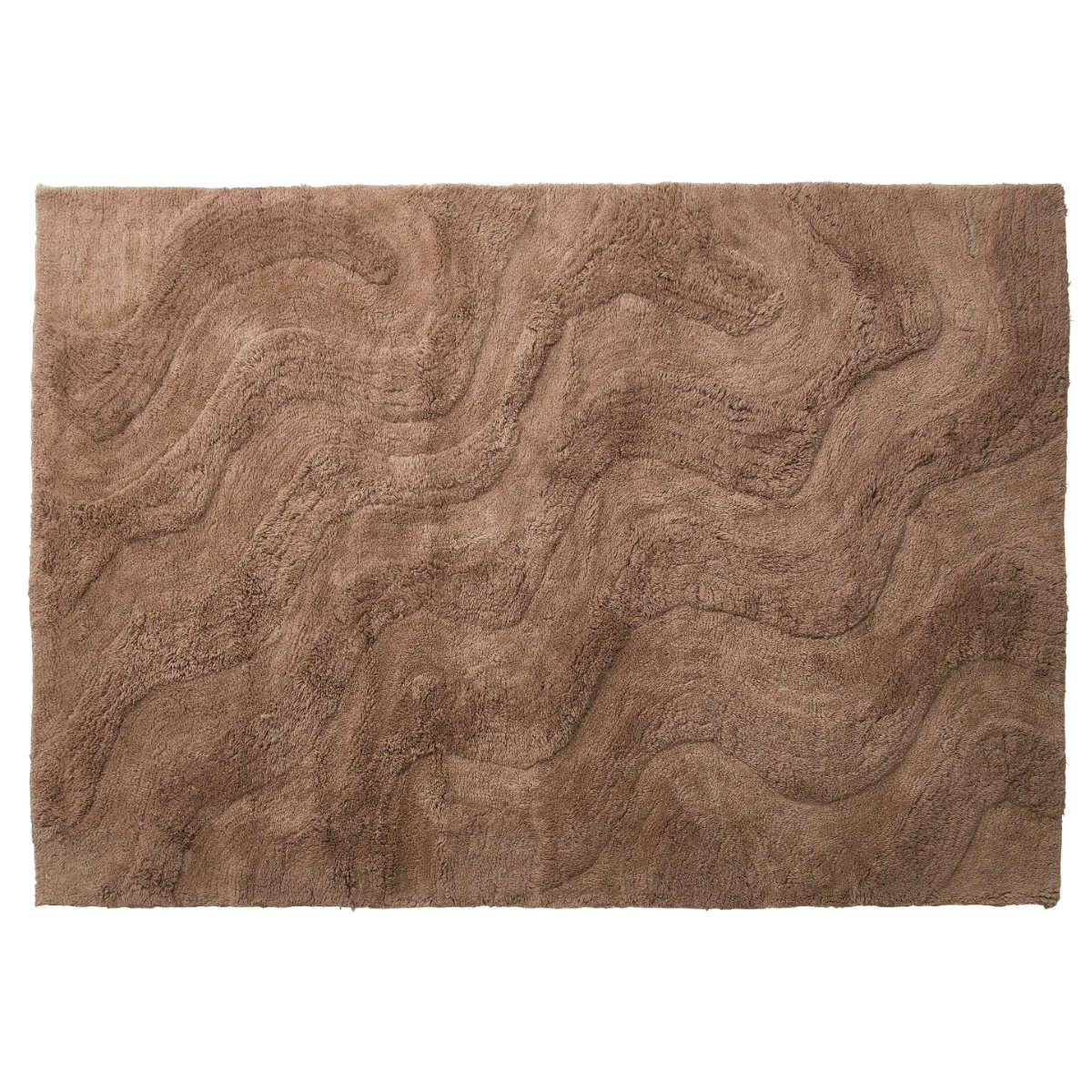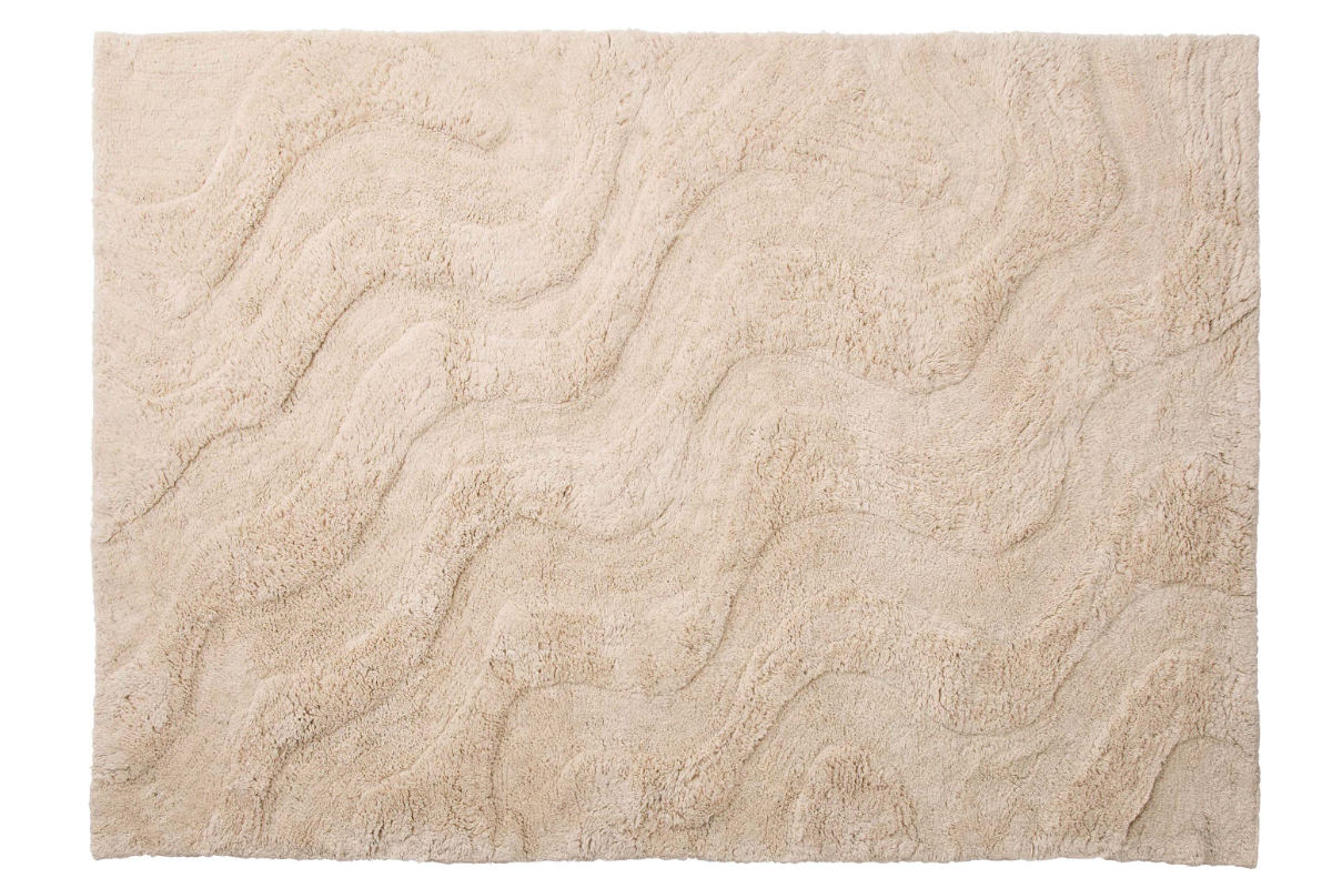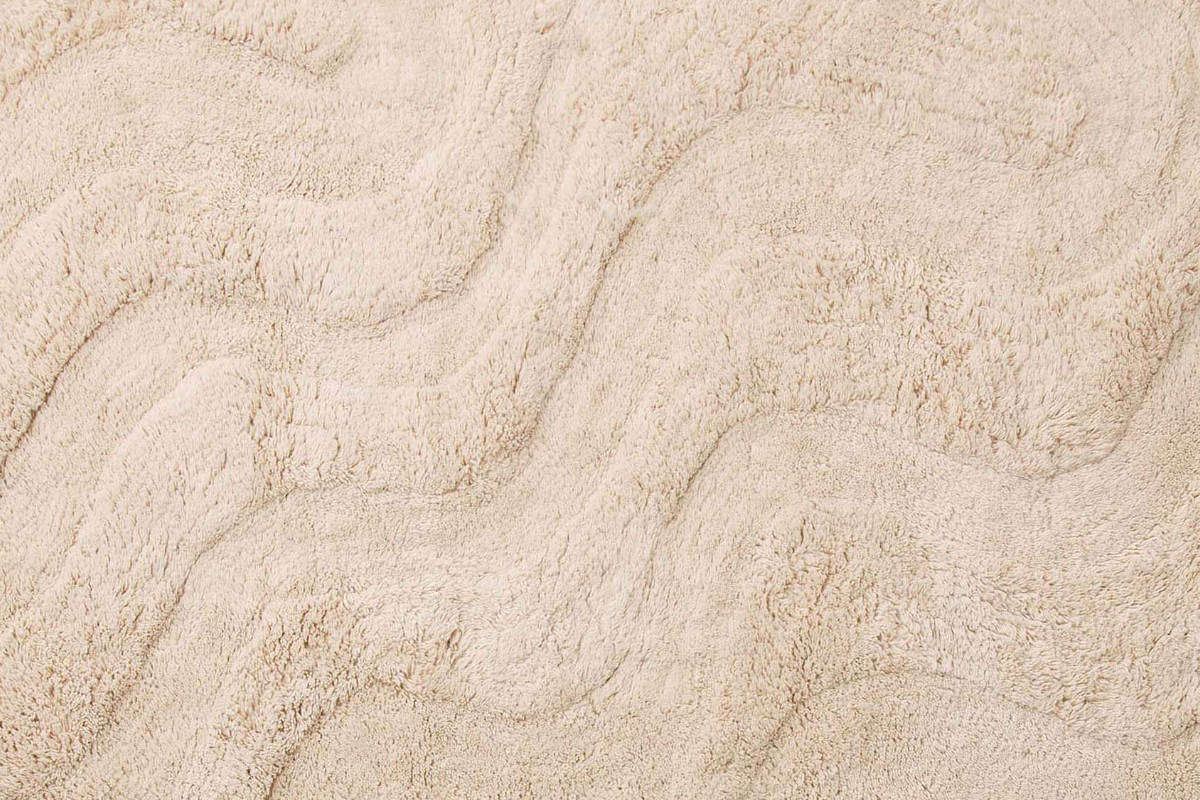 やわらかく波打つウェーブデザインが空間にさりげない表情を添えるラグです。ウールとコットンを使用したやさしい風合いで、ナチュラルな雰囲気に仕上げています。主張しすぎず、さまざまなインテリアに自然となじむ一枚です。