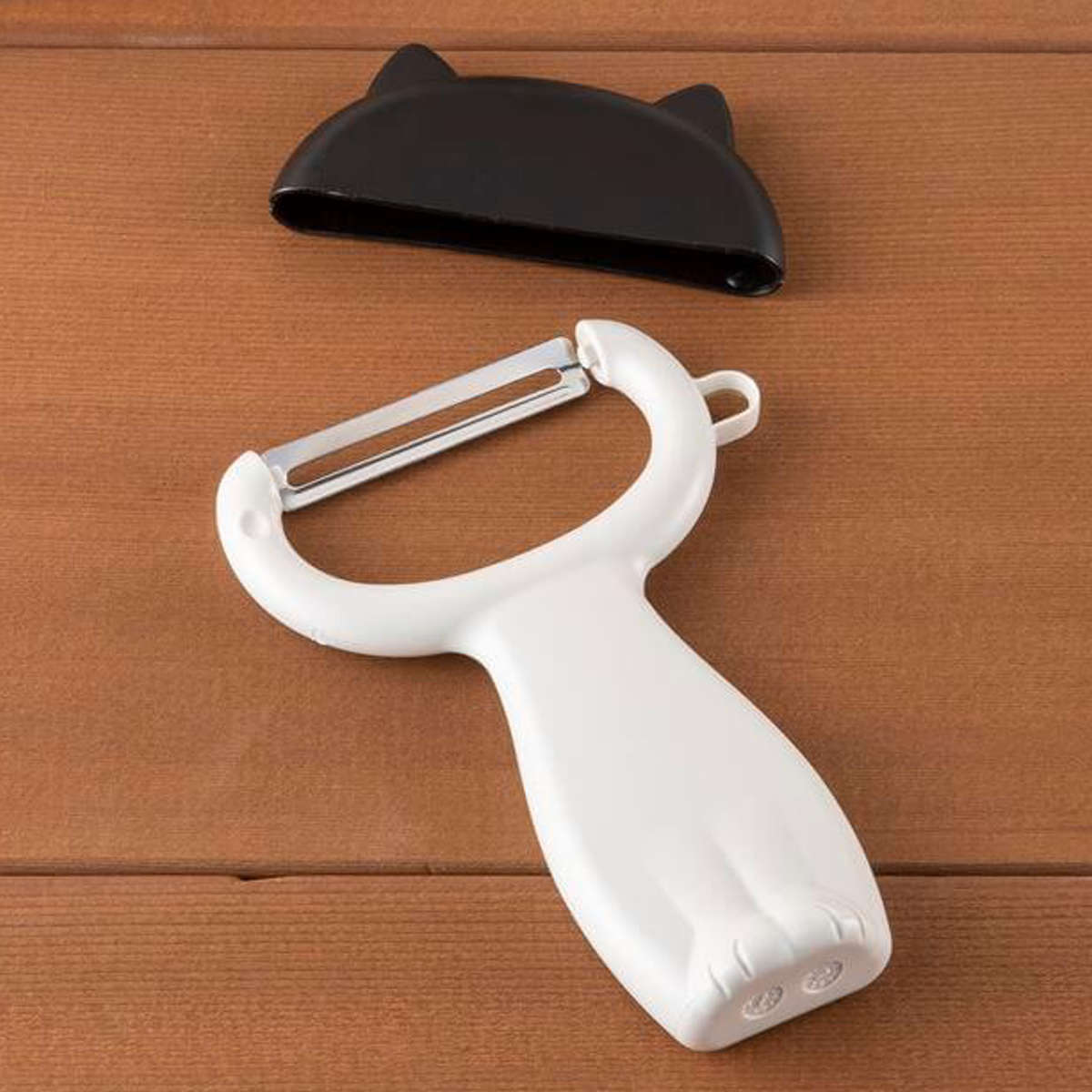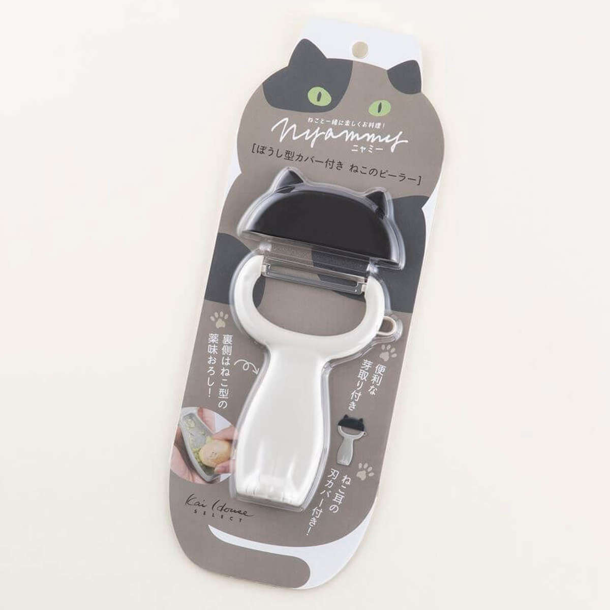 ねこがちょこんと座ったシルエットをモチーフにしたピーラーです。ねこ耳のぼうし型カバー付きなので、収納時にも安心です。