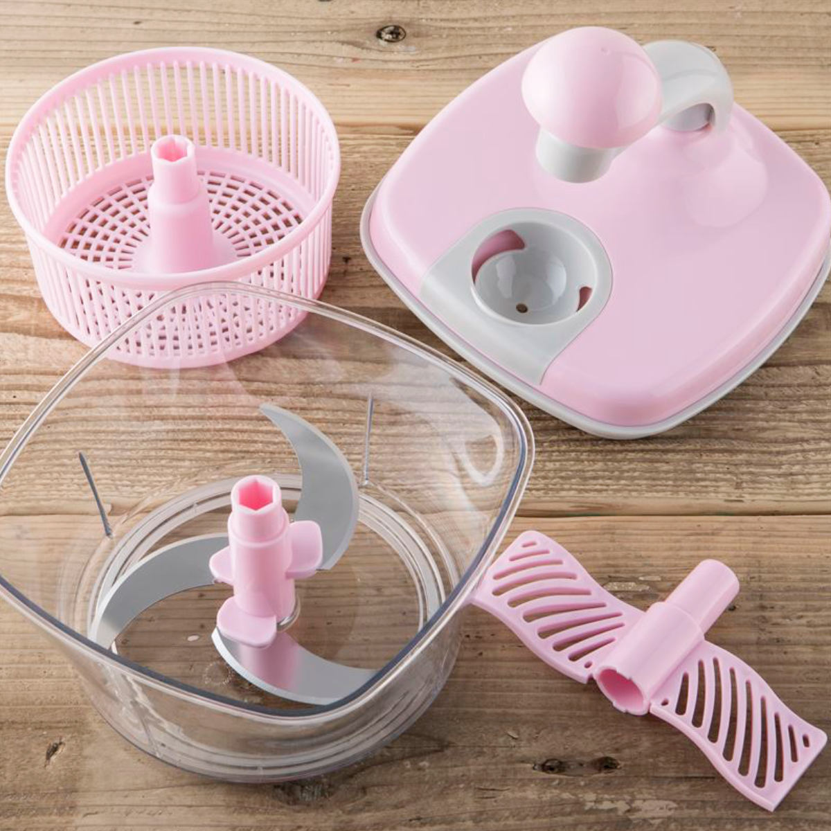 | 材質 | ノブ、エッグセパレーター、刃軸、刃カバー、羽、水切りカゴ:ポリプロピレン ハンドル:ABS樹脂 フタ:ポリプロピレン、ABS樹脂 刃体:ステンレス刃物鋼 容器:AS樹脂・エラストマー樹脂 滑り止め:熱可塑性エラストマー |