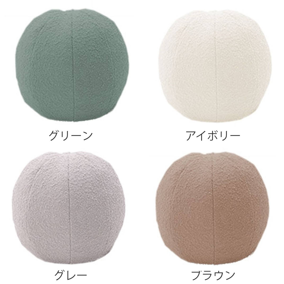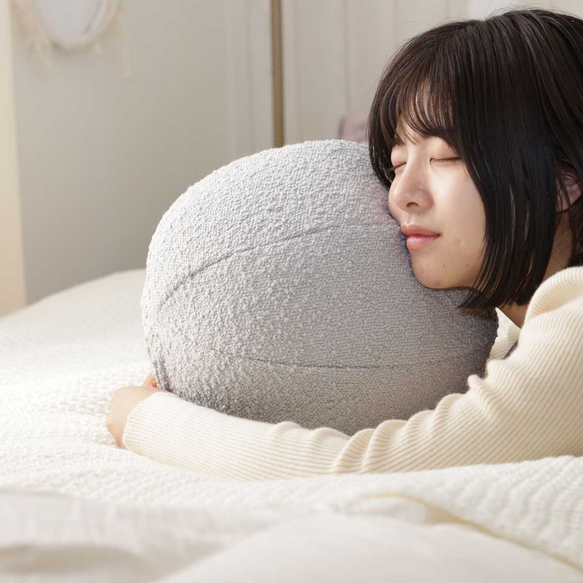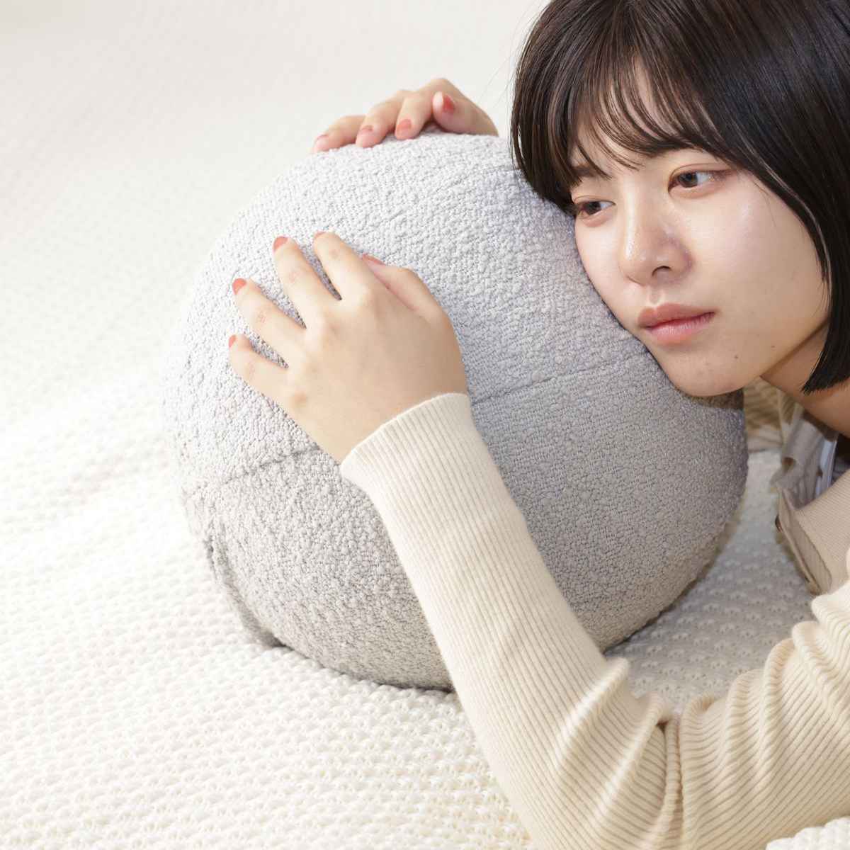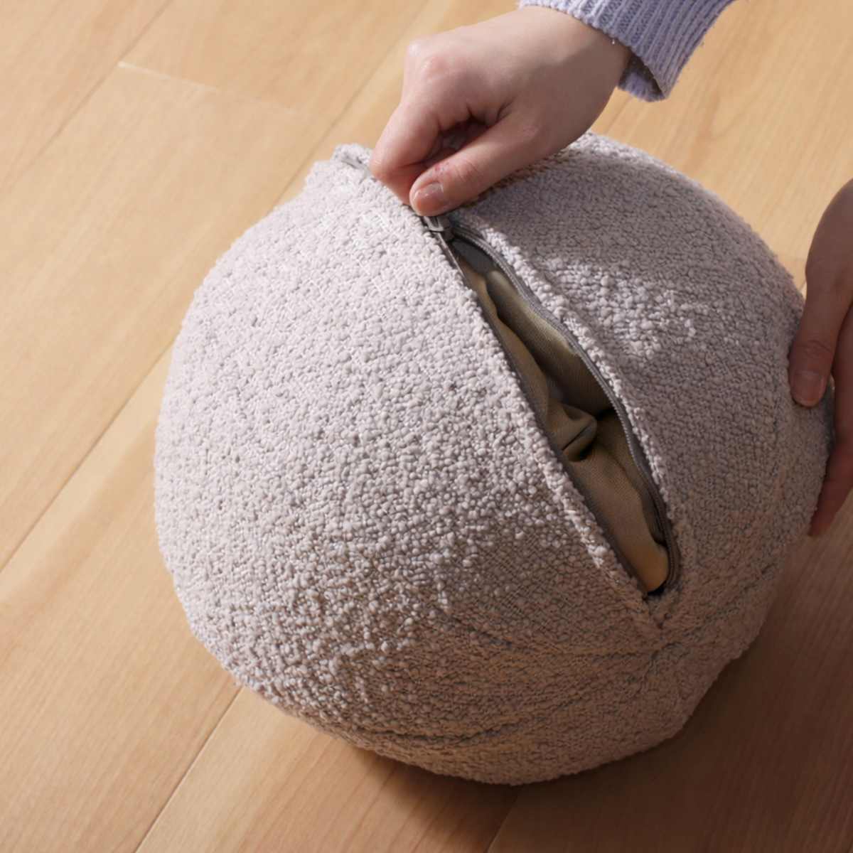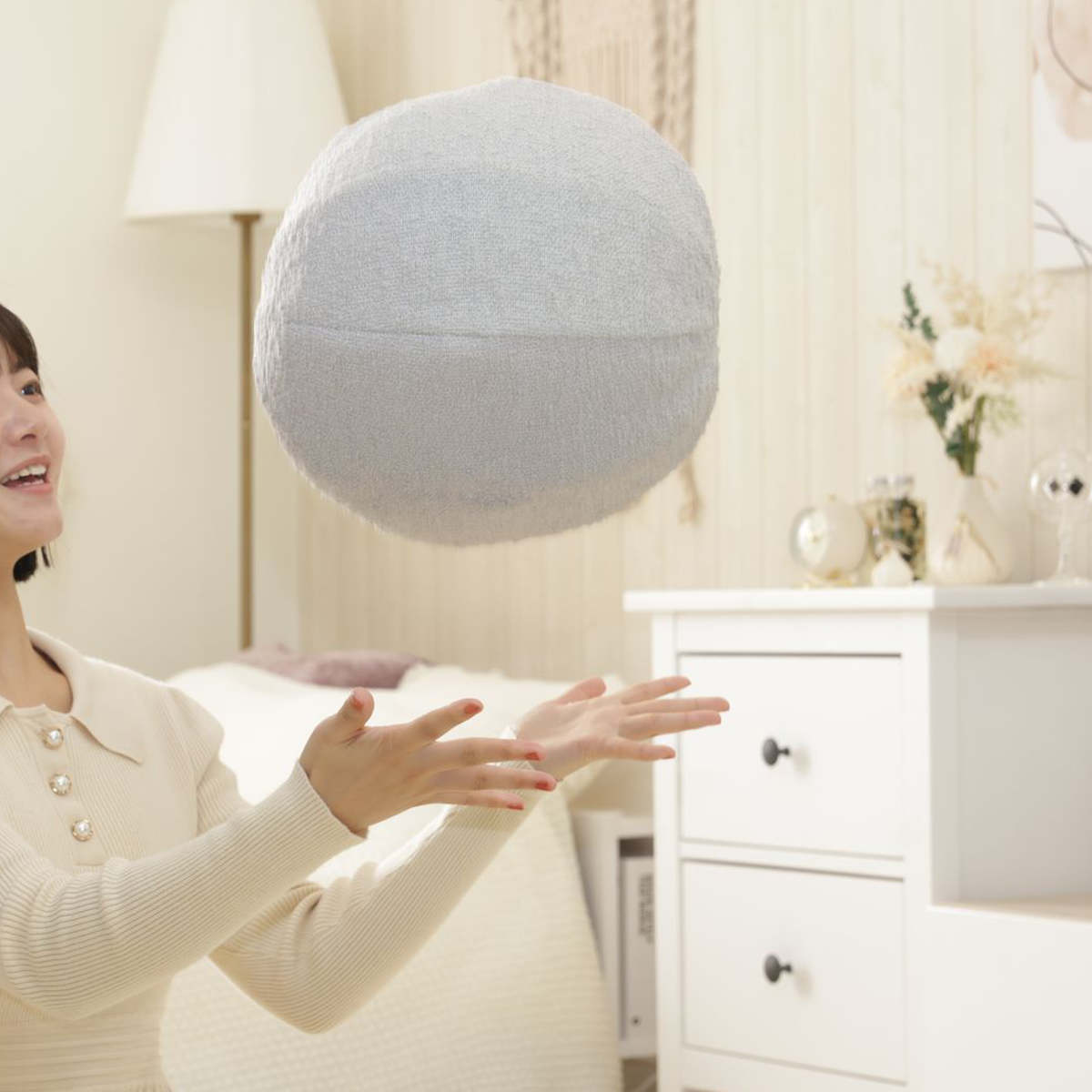 もこもこ・ふわふわのブークレ生地を使用した、丸みのあるボール型デザイン。見た目の愛らしさとやさしい肌ざわりで、お部屋に癒しのアクセントを添えます。