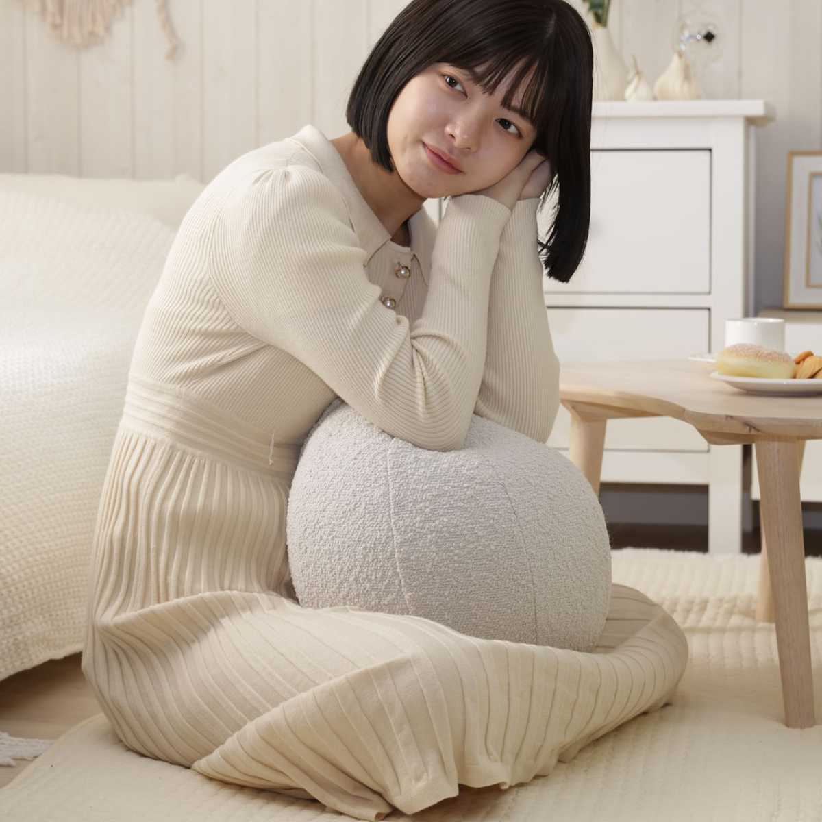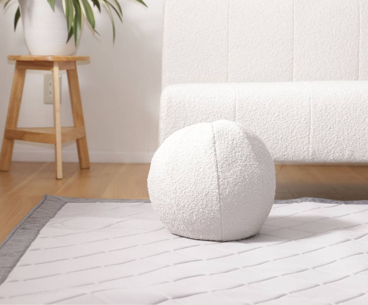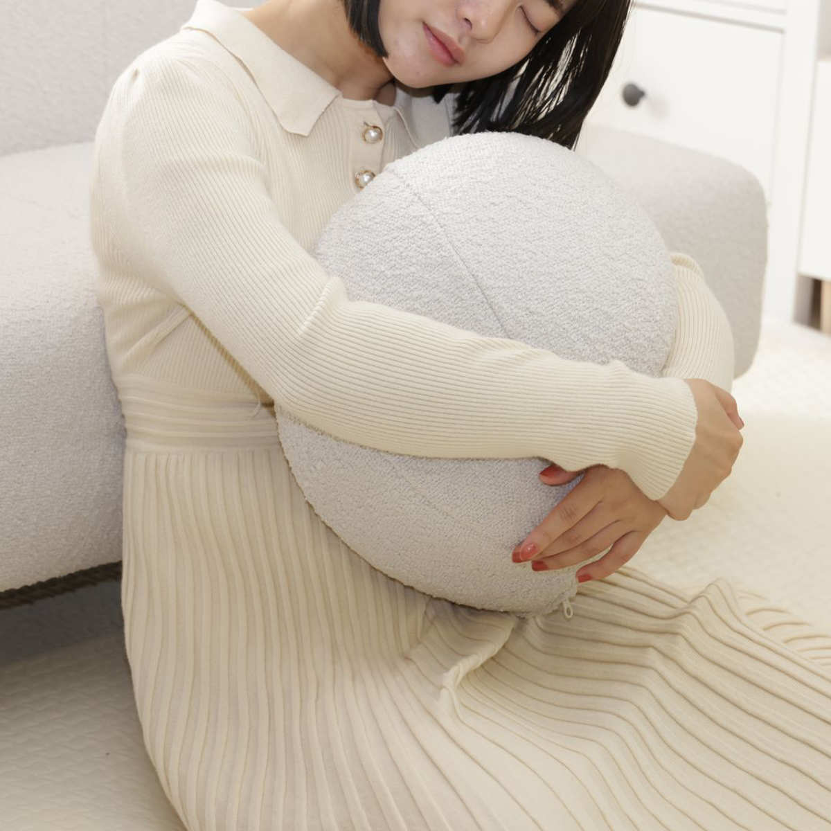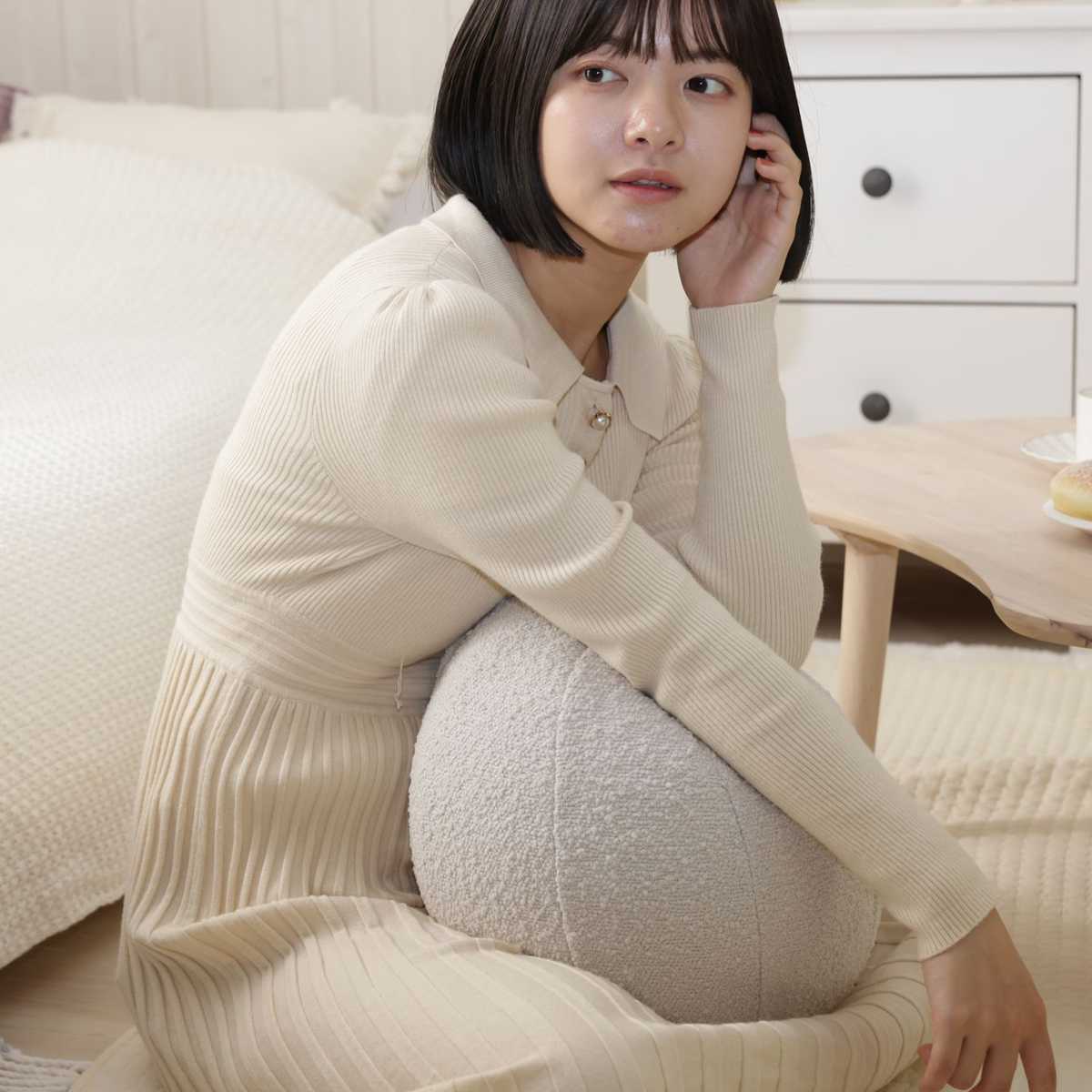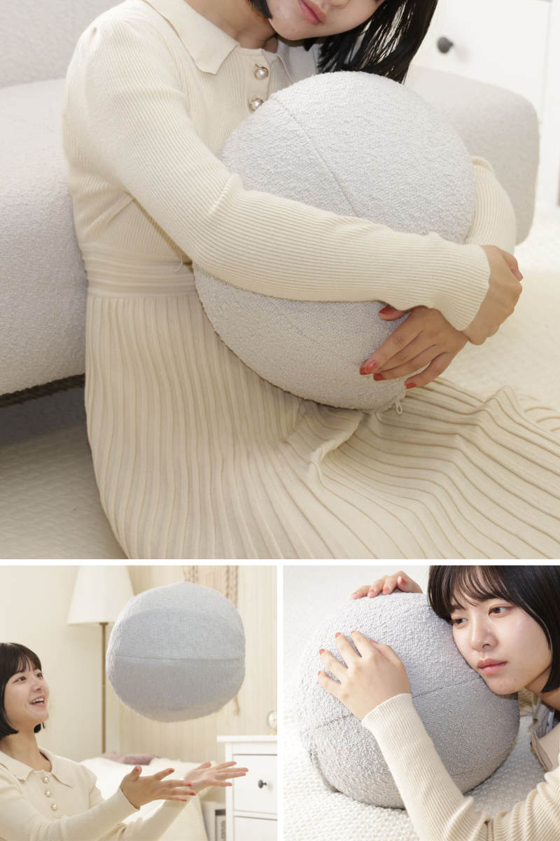 もこもこ・ふわふわのブークレ生地を使用した、丸みのあるボール型デザイン。見た目の愛らしさとやさしい肌ざわりで、お部屋に癒しのアクセントを添えます。