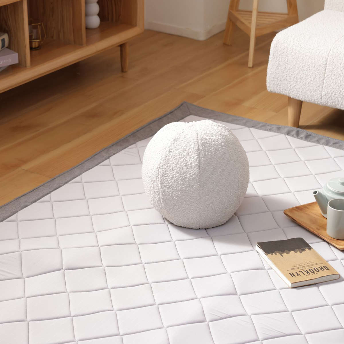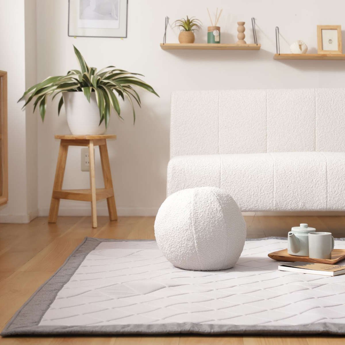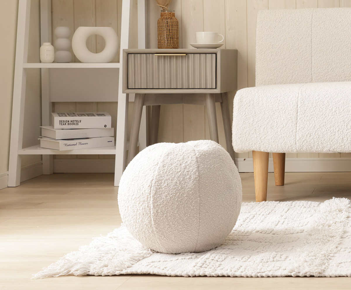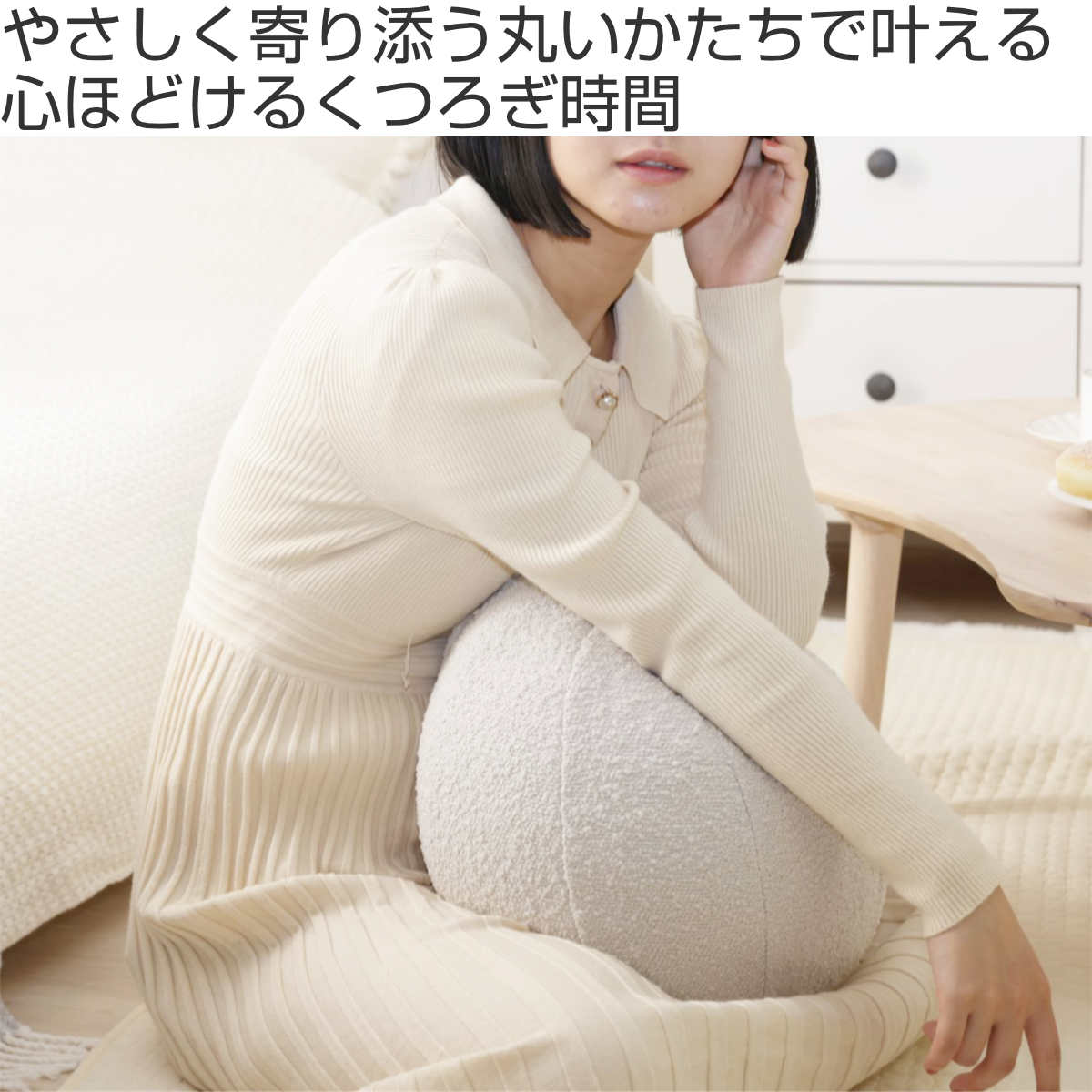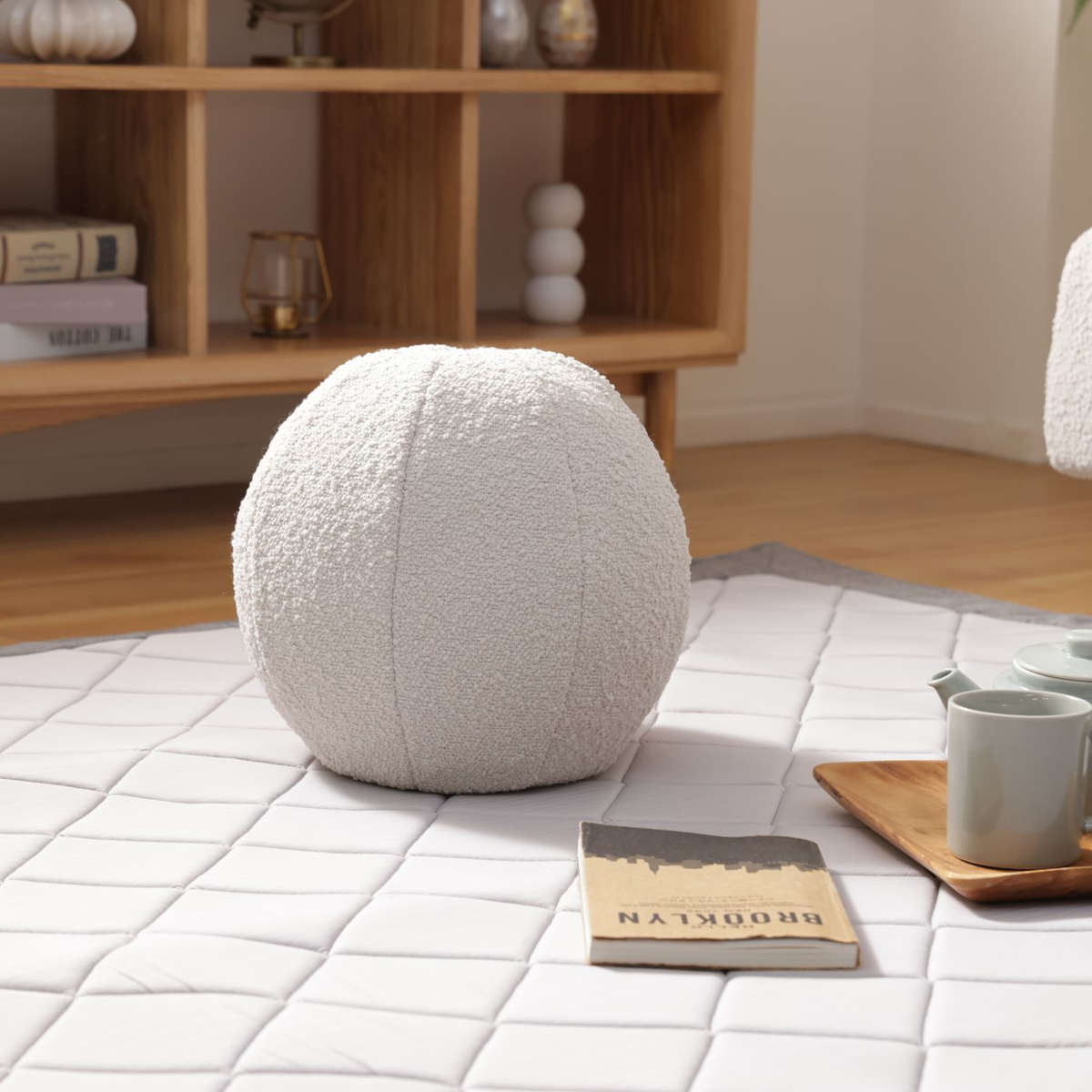 もこもこ・ふわふわのブークレ生地を使用した、丸みのあるボール型デザイン。見た目の愛らしさとやさしい肌ざわりで、お部屋に癒しのアクセントを添えます。