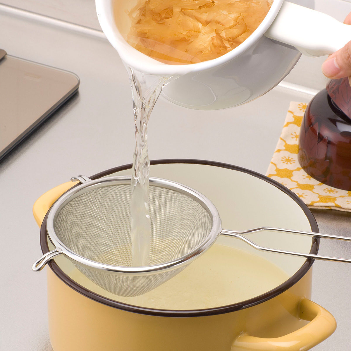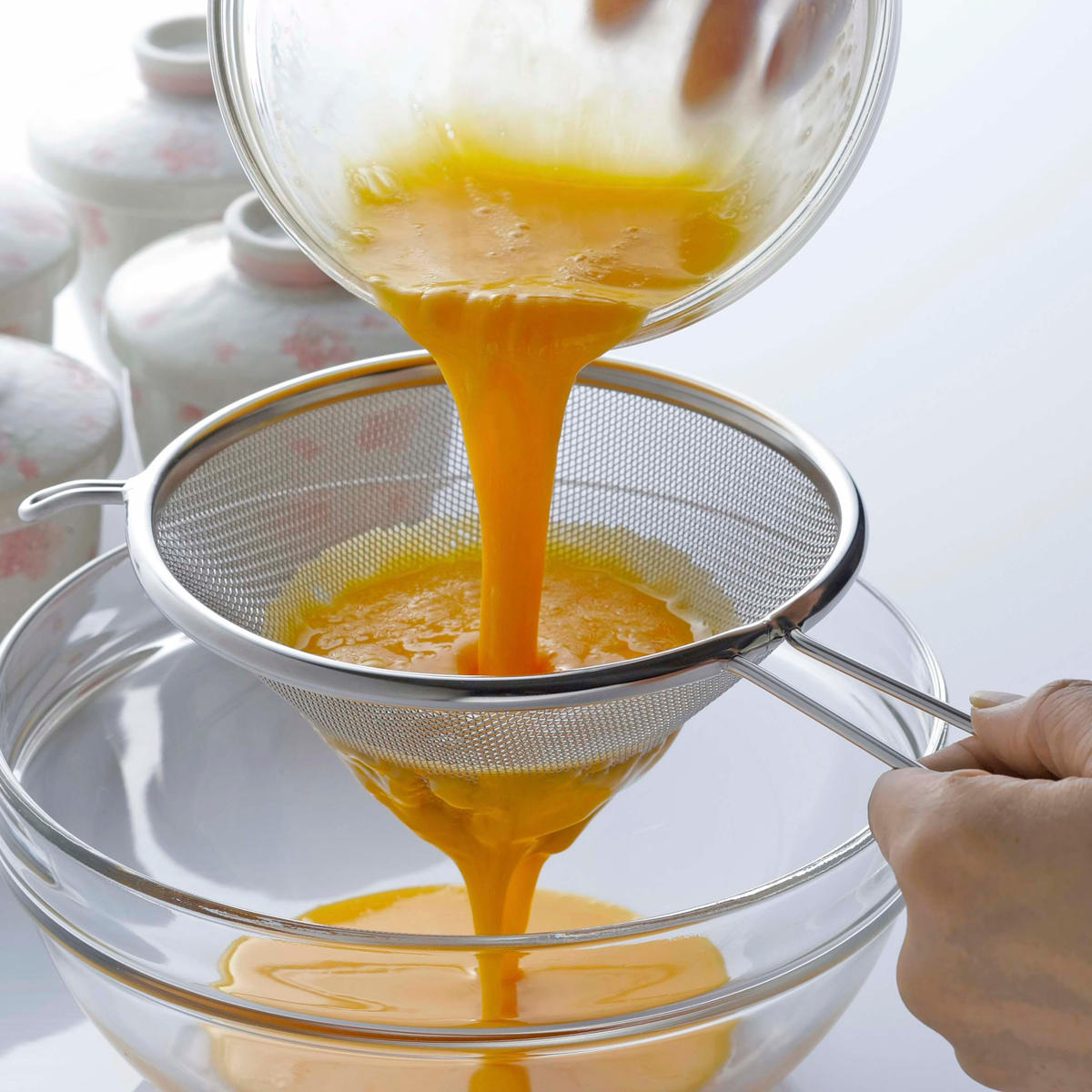 泡やダマをこして、口当たりなめらかに仕上げられるこし器です。スープ作りはもちろん、茶碗蒸しやプリンなどの下ごしらえにも便利にお使いいただけます。
