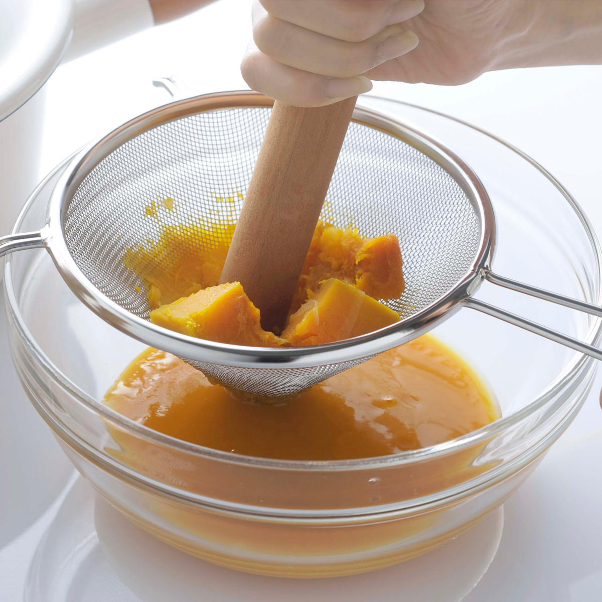細かすぎず粗すぎない絶妙なアミ目で、液体や食材をスムーズにこせます。スープや卵液などを素早くこしてなめらかに仕上げ、かぼちゃやさつまいもなど茹でた野菜はつぶしながらこせるため、うらごしとしても使えて便利です。