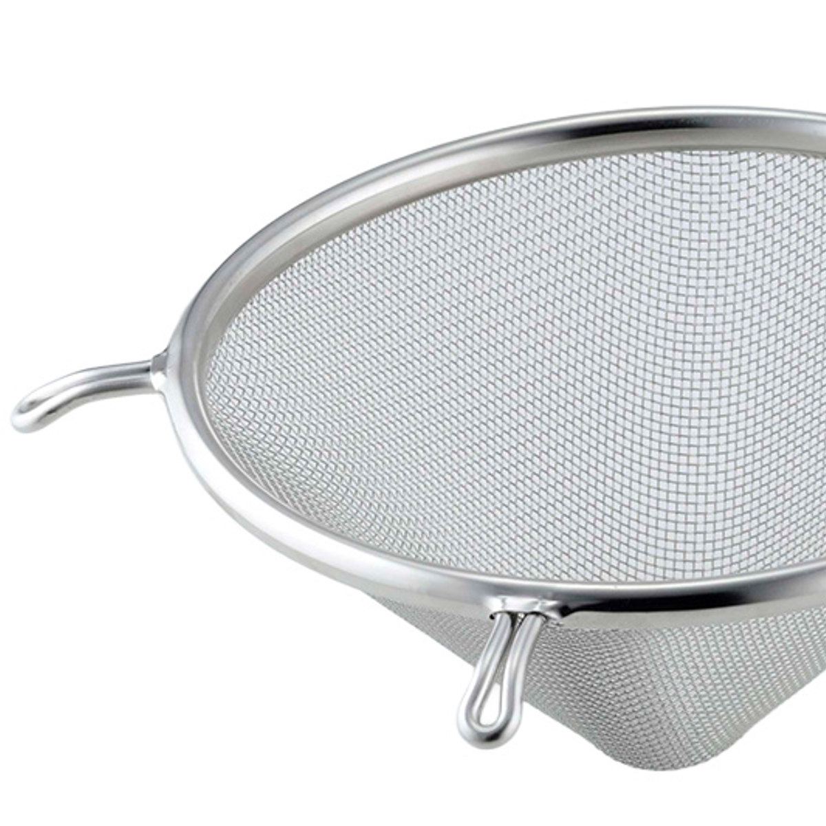 従来品よりも丈夫なアミを採用した、変形しにくい作りです。鍋やボウルのフチに掛けられるフック付きで、安定して作業ができ、長く使える設計です。